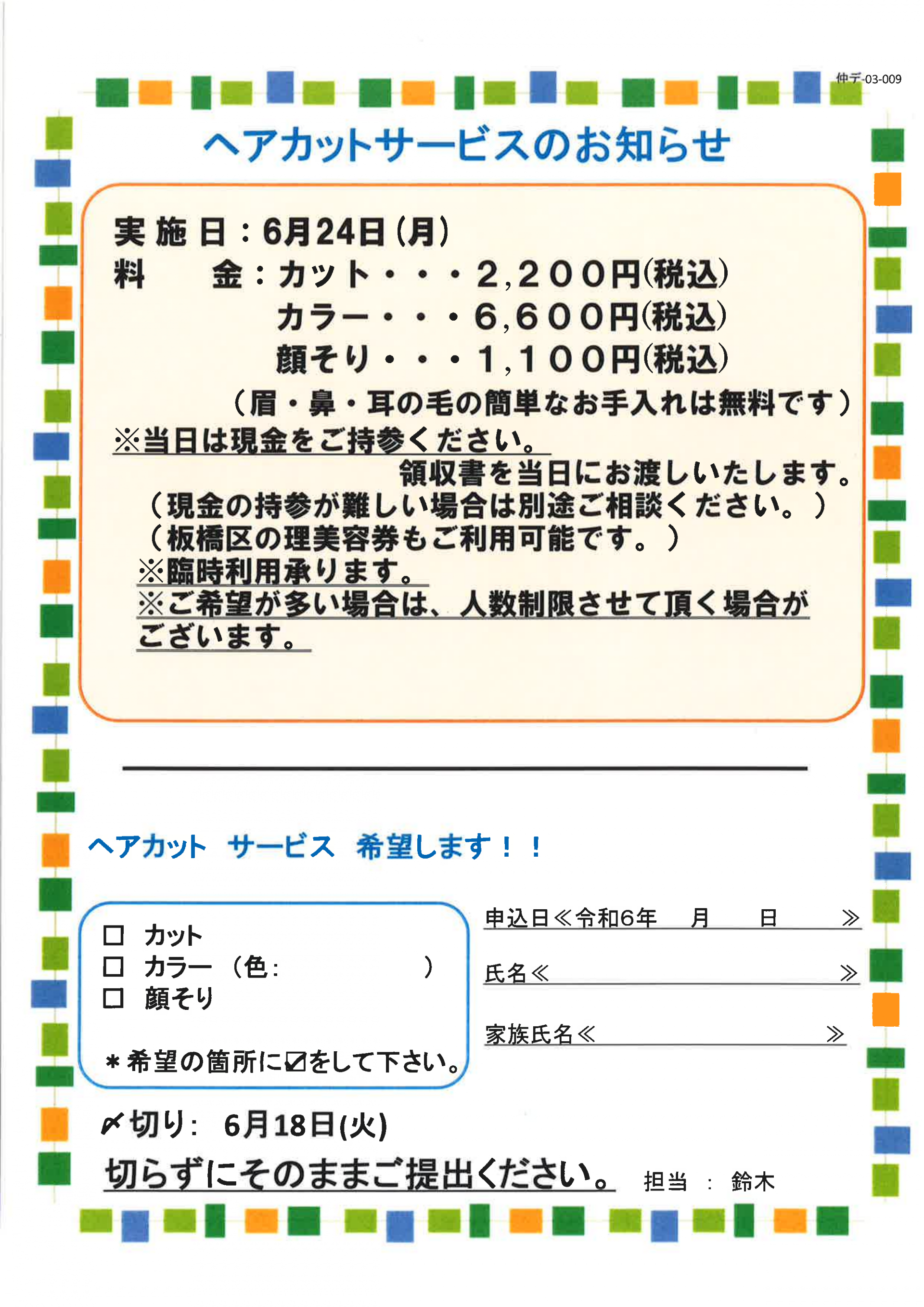 本日よりご利用者様へ、6月のヘアカットサービスのお知らせをお配りしています。