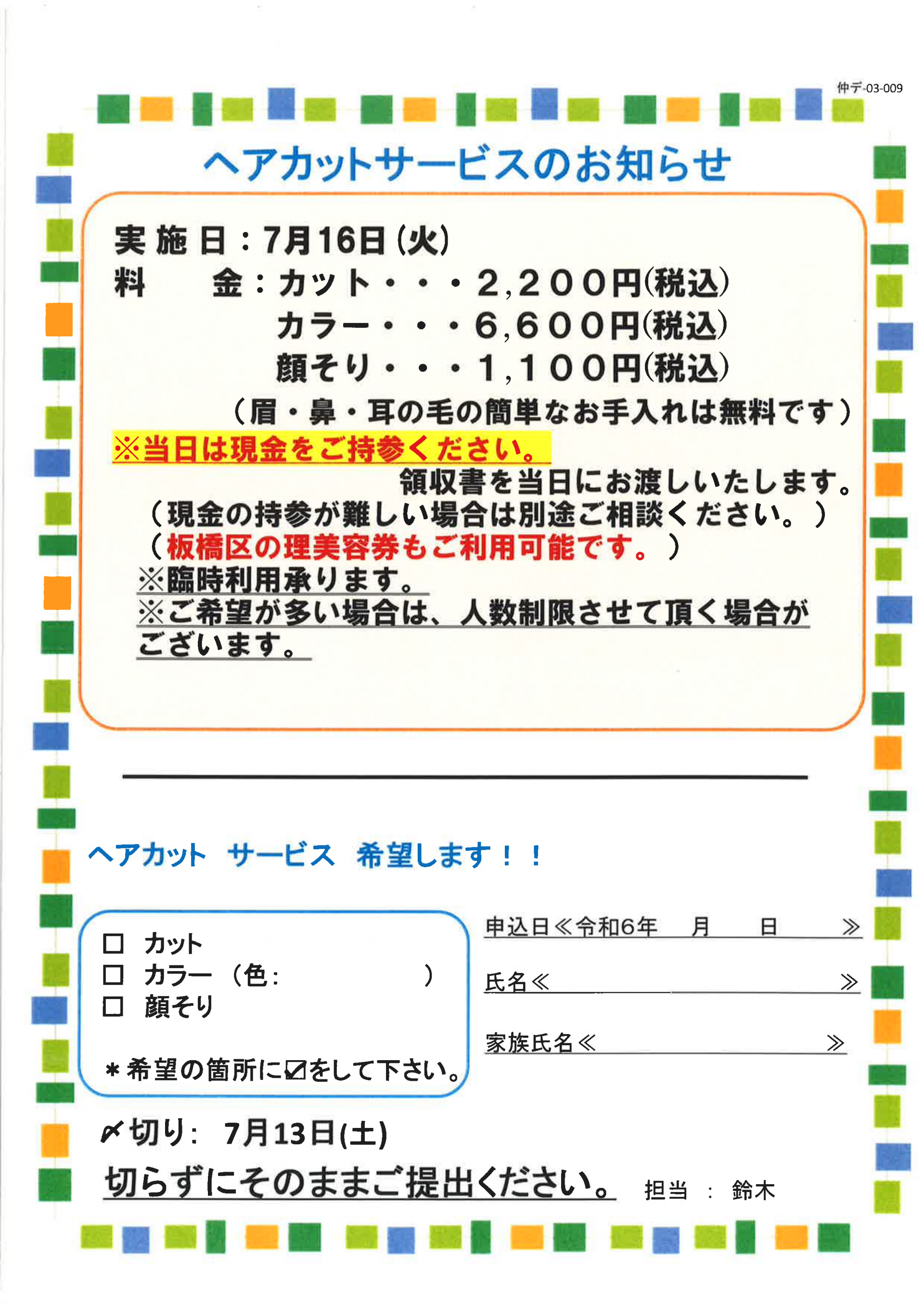 本日よりご利用者様に7月のヘアカットサービスのお知らせをお配りしています。