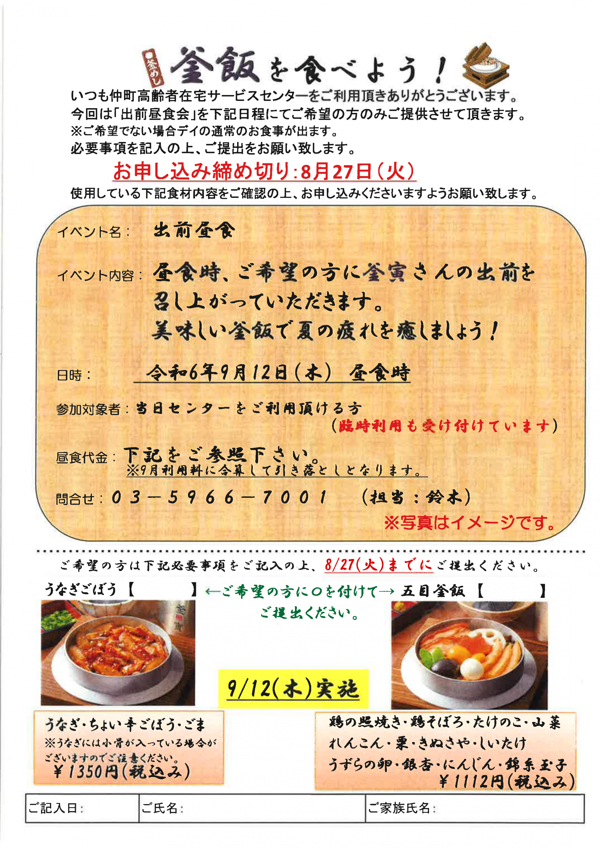 9月の出前昼食のお知らせをご利用者様へ配布しております。