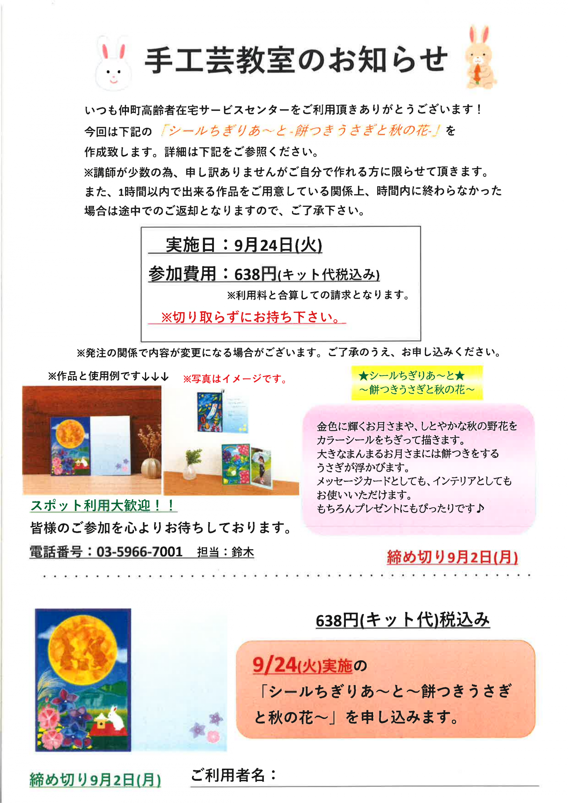 9月手工芸のお知らせをご利用者様にお配りしています。
