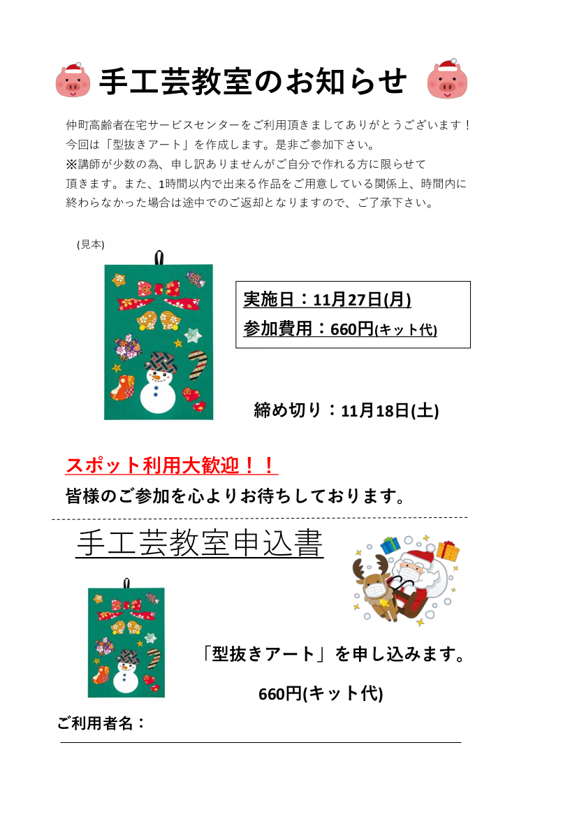 2023.11.03 お知らせ 11月の手工芸サークルのお知らせです。 Tweet シェアする こんにちは~仲町高齢者在宅サービスセンターです! いつも当ホームページをご覧頂きありがとうございます。 11月の手工芸決まりました~ 担当:山城 前の記事 2023.11.03 お知らせ 11月の献立表です。 次の記事 2023.11.02 お知らせ 10月の手工芸~その2~ 一覧へ戻る