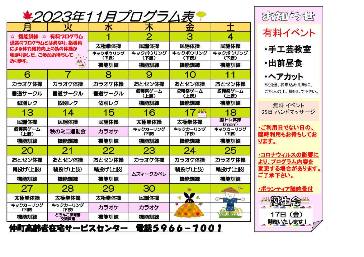 2023.11.03 お知らせ 11月のプログラム表です! Tweet シェアする こんばんは~仲町高齢者在宅サービスセンターです! いつも当ホームページをご覧頂きありがとうございます。 11月のプログラム表です!沢山のイベントを計画しています~ 11月の目玉は「運動会」です!! 前の記事 2023.11.03 お知らせ フラワーアレンジメントのお知らせです!! 次の記事 2023.11.03 お知らせ 11月の献立表です。 一覧へ戻る