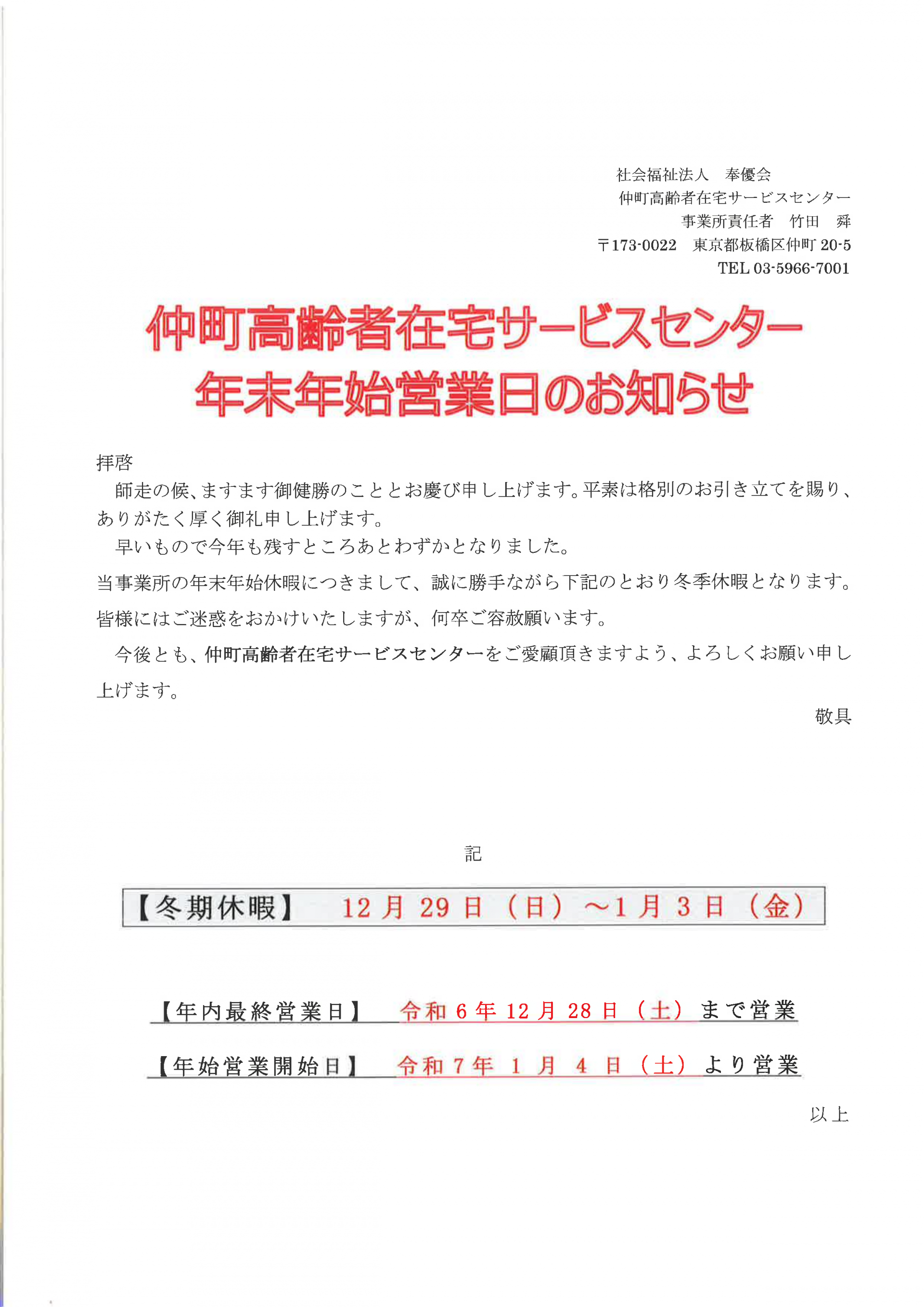 仲町高齢者在宅サービスセンター「年末年始、営業日程のお知らせ」です。