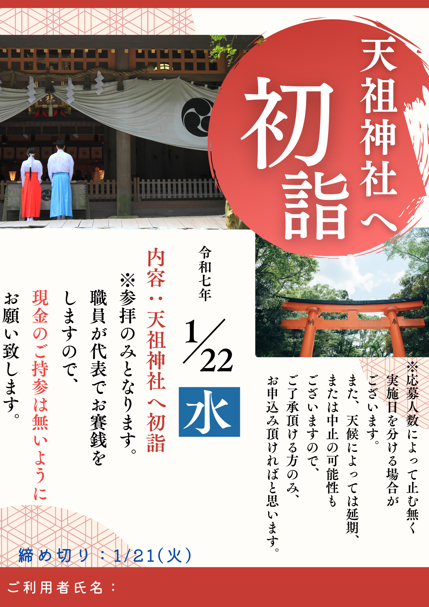 さて、今回はタイトルの通り、仲町在セン「初詣外出」のお知らせです☆
