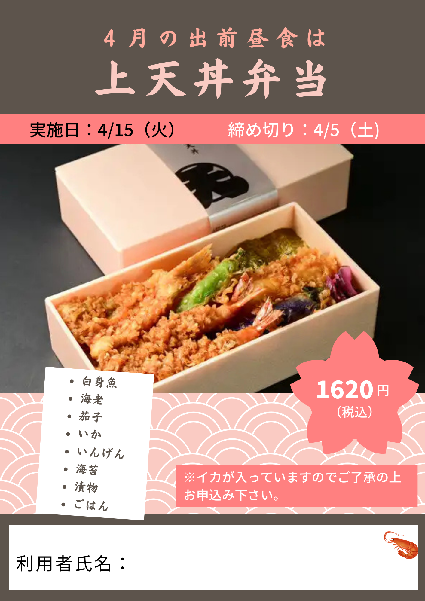 今回は、仲町在セン4月の出前昼食のお知らせです☆