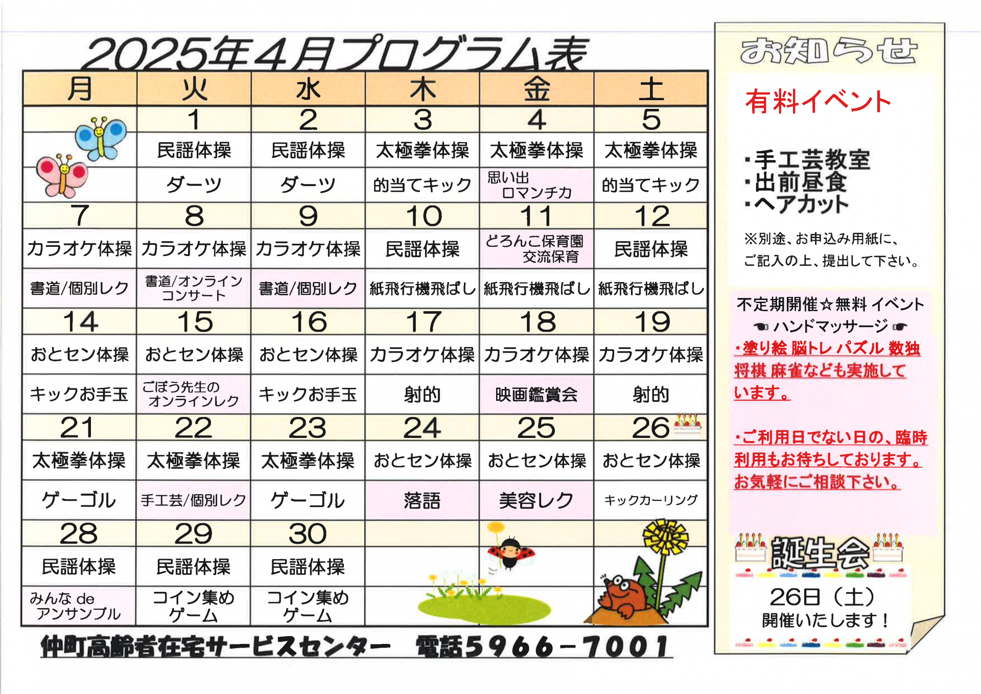 仲町在セン、4月のプログラム表をご利用者様にお配りしております。