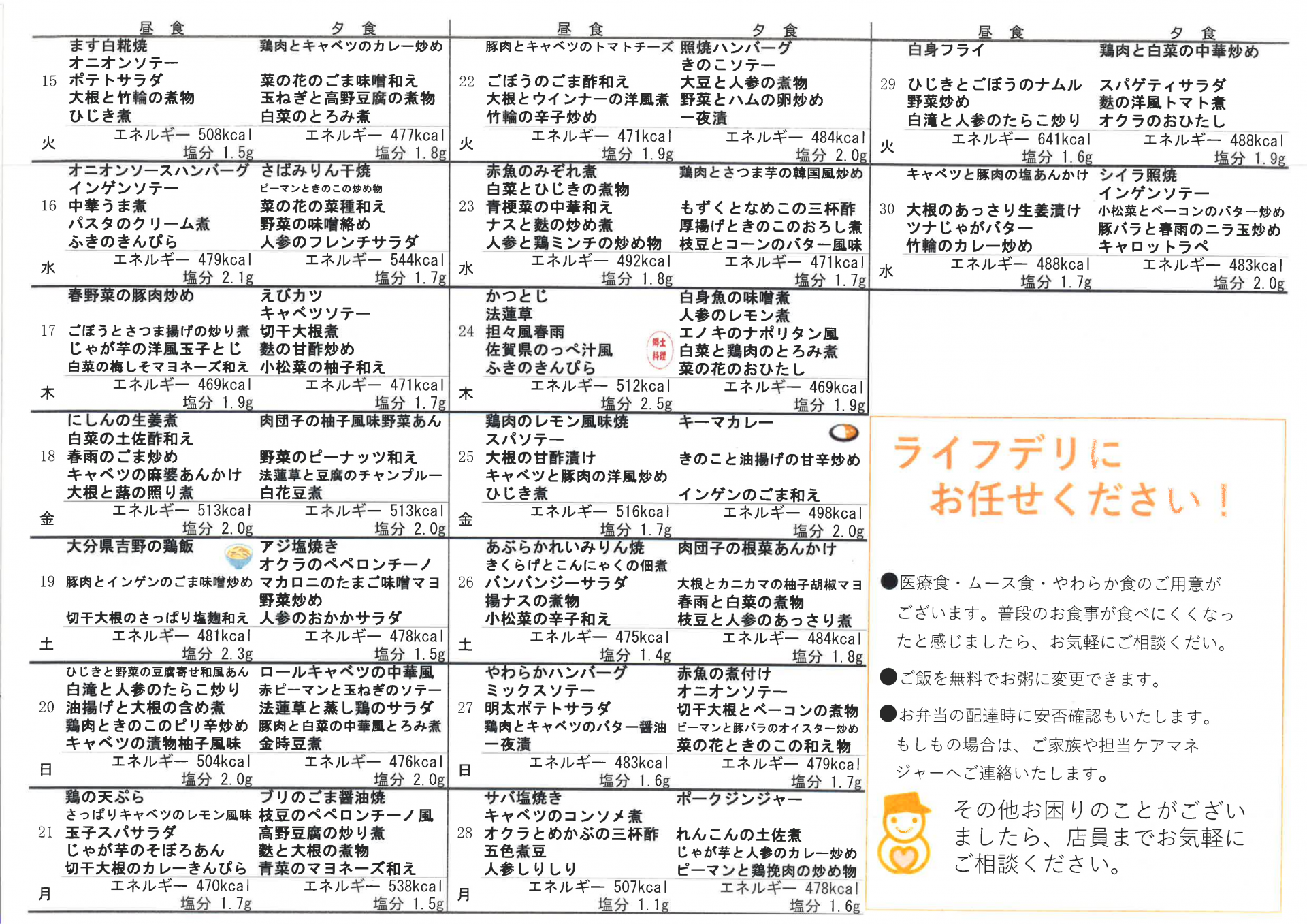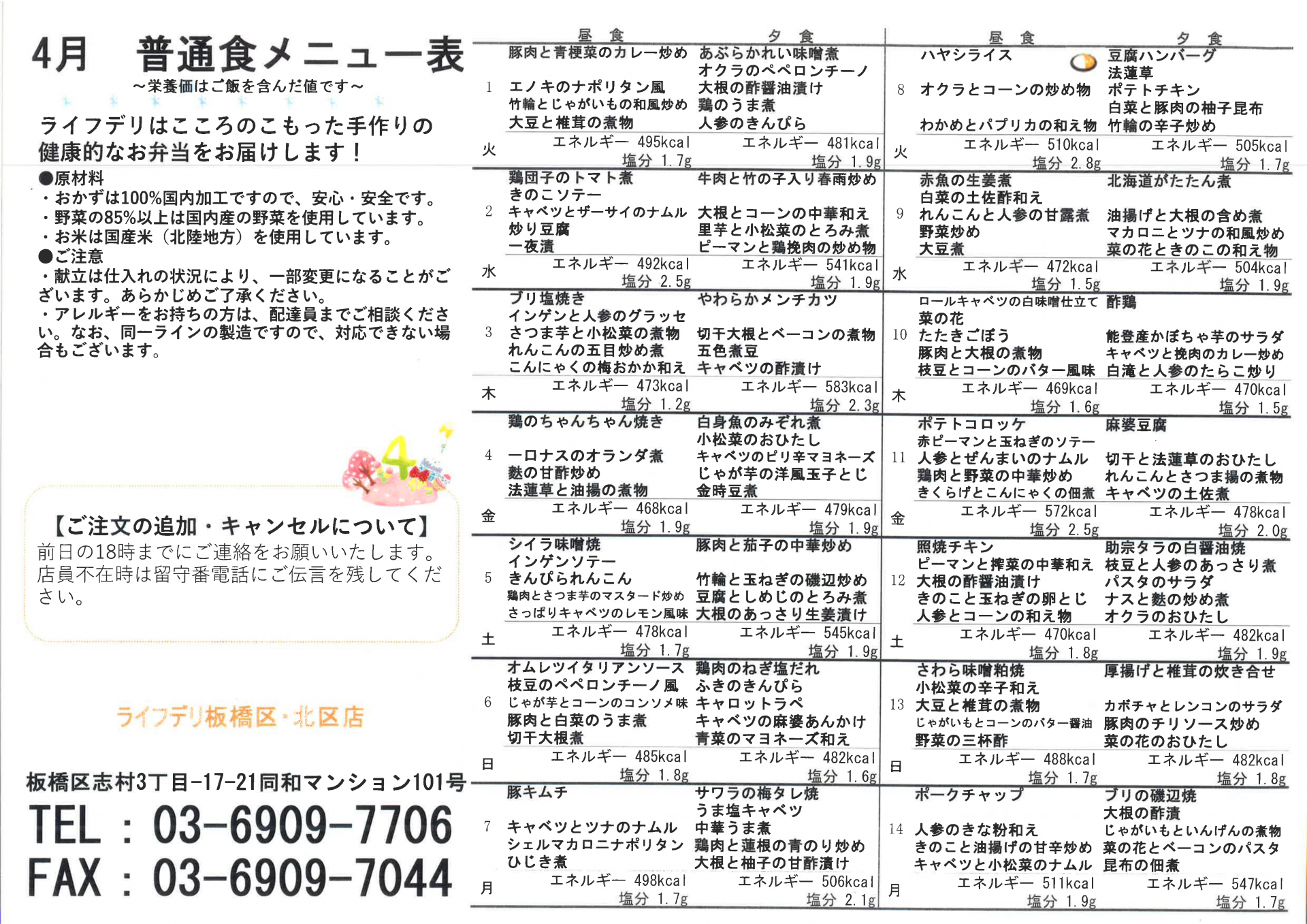 仲町在セン、4月の献立表をご利用者様にお配りしております。