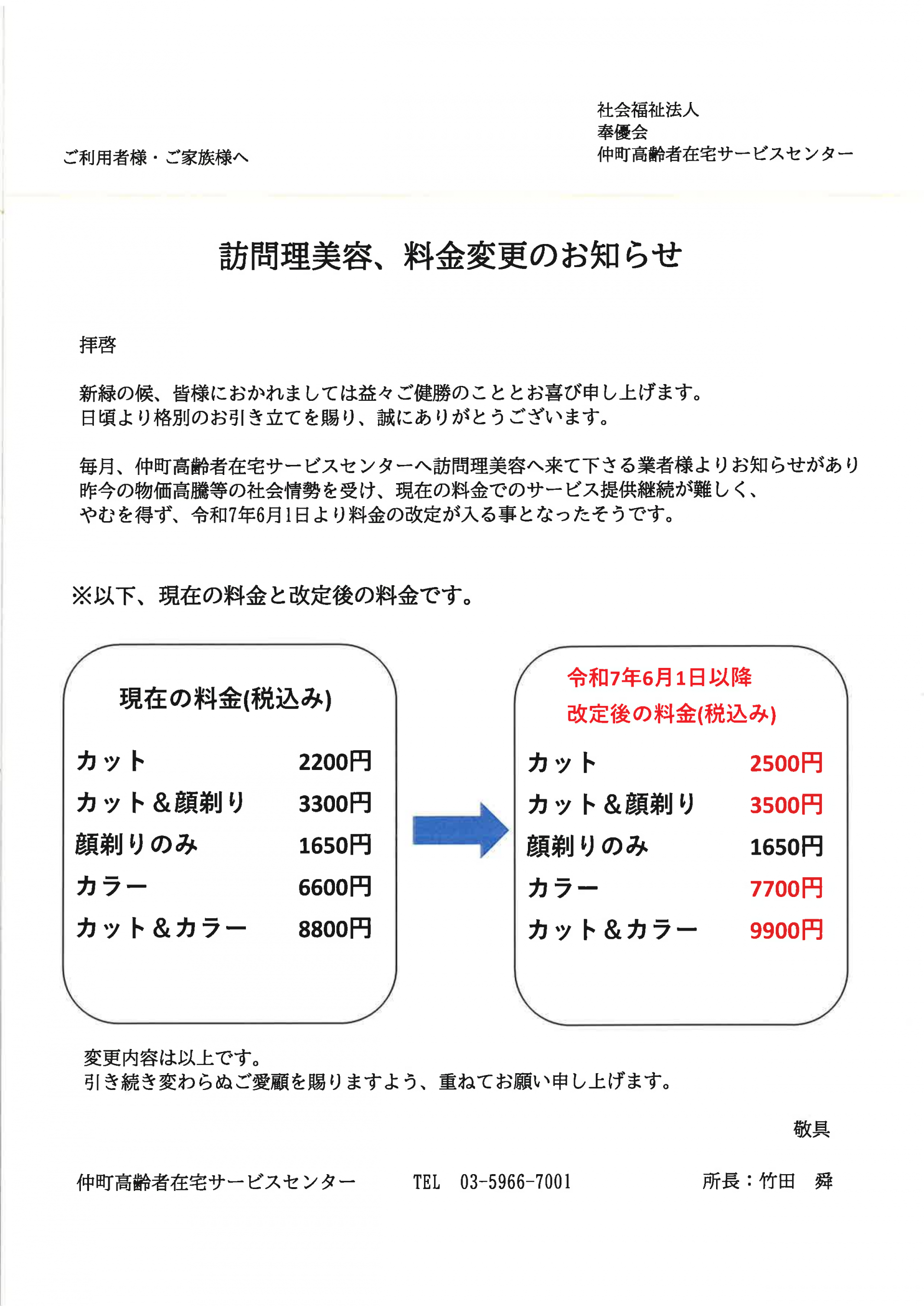 【仲町在セン】ヘアカットサービス利用料金改定についてのお知らせです。