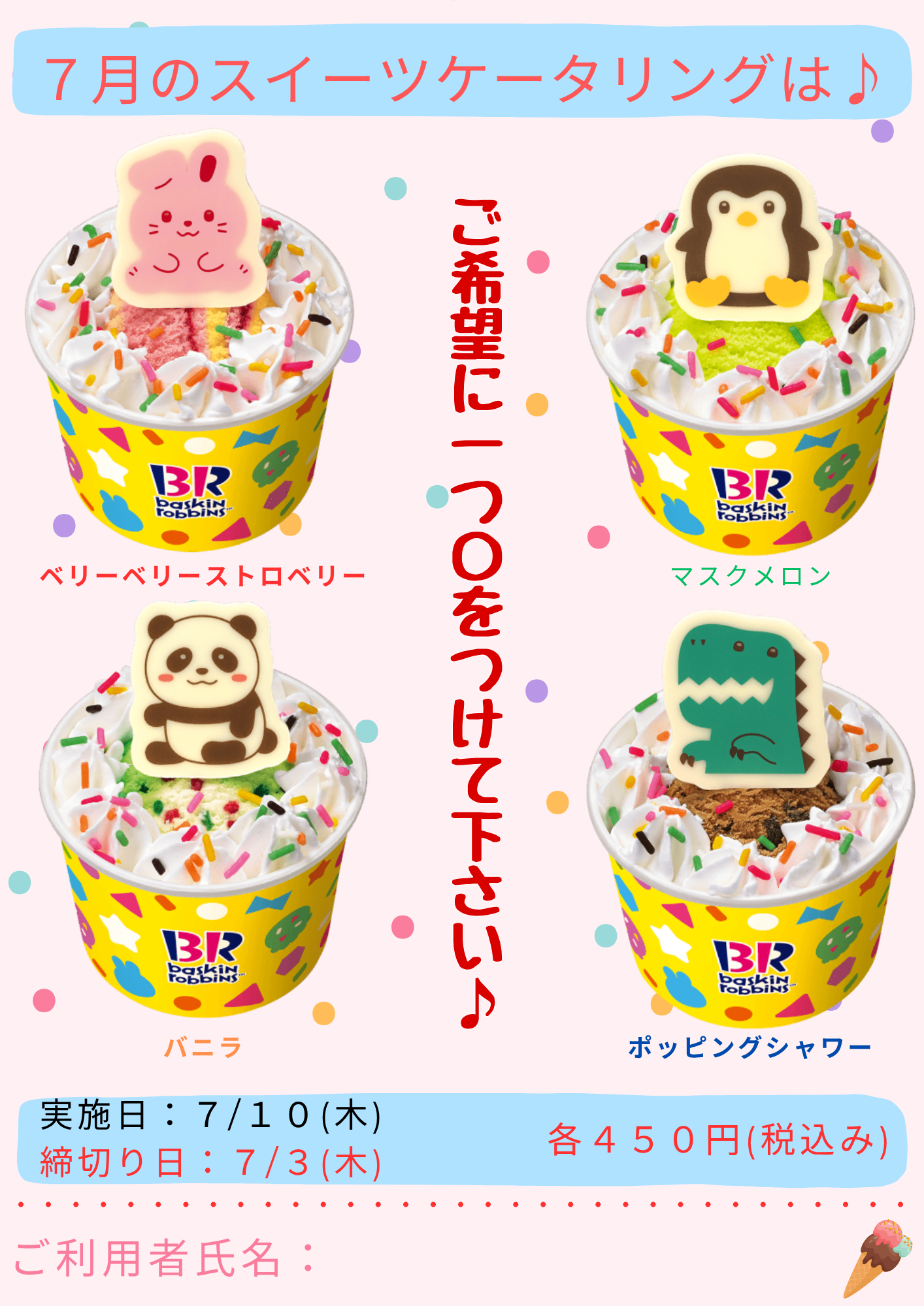 今回は、仲町在セン7月のスイーツケータリングのお知らせです♪