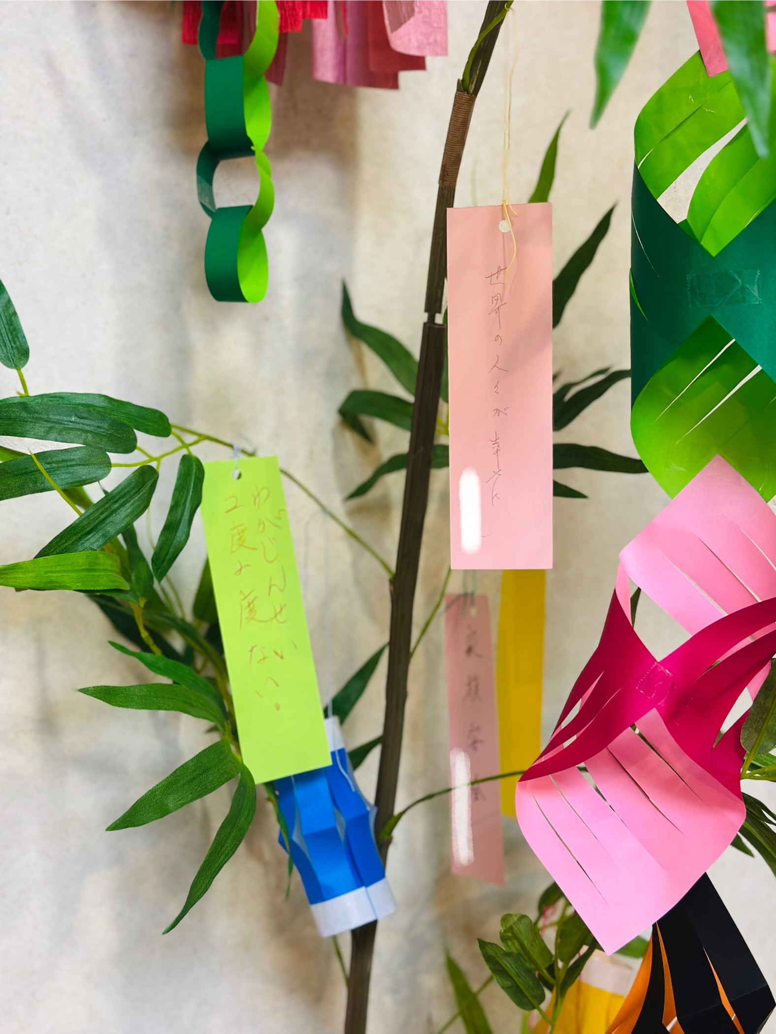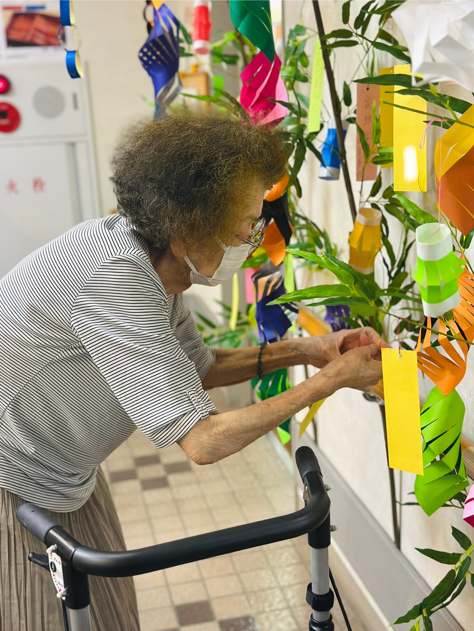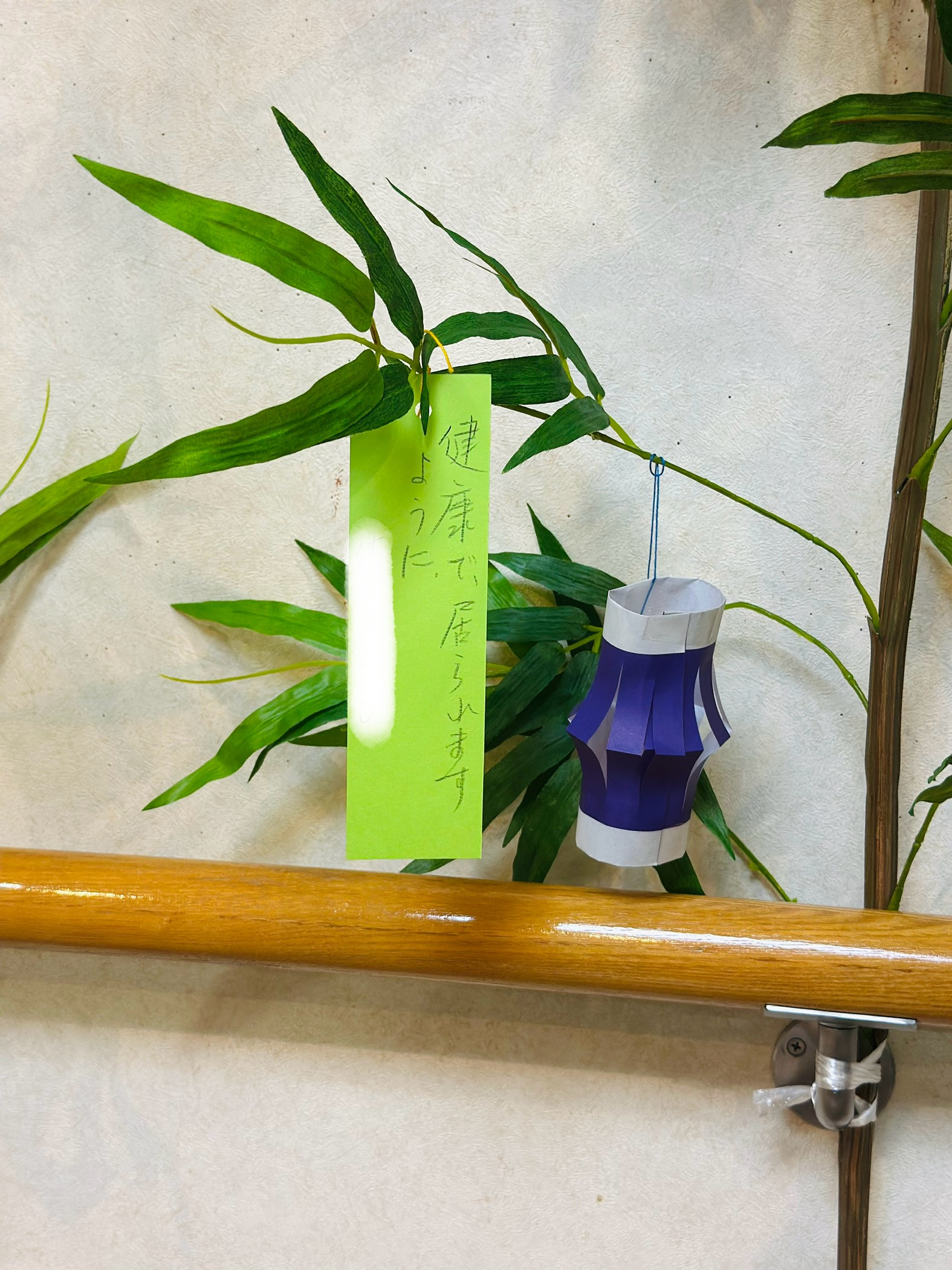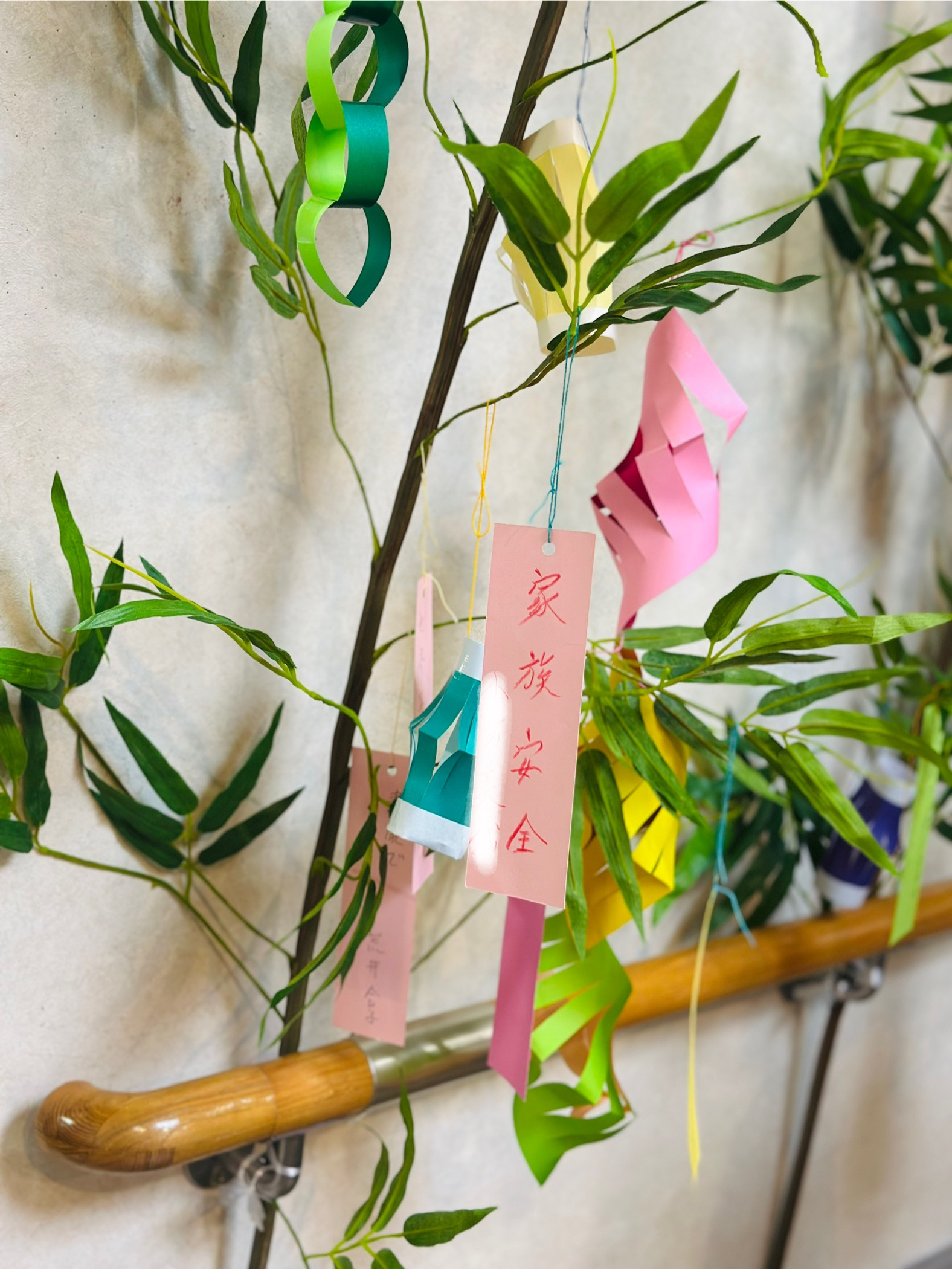 仲町在センでは七夕に向けて飾りと共に短冊に願い事を書いて頂いています☆