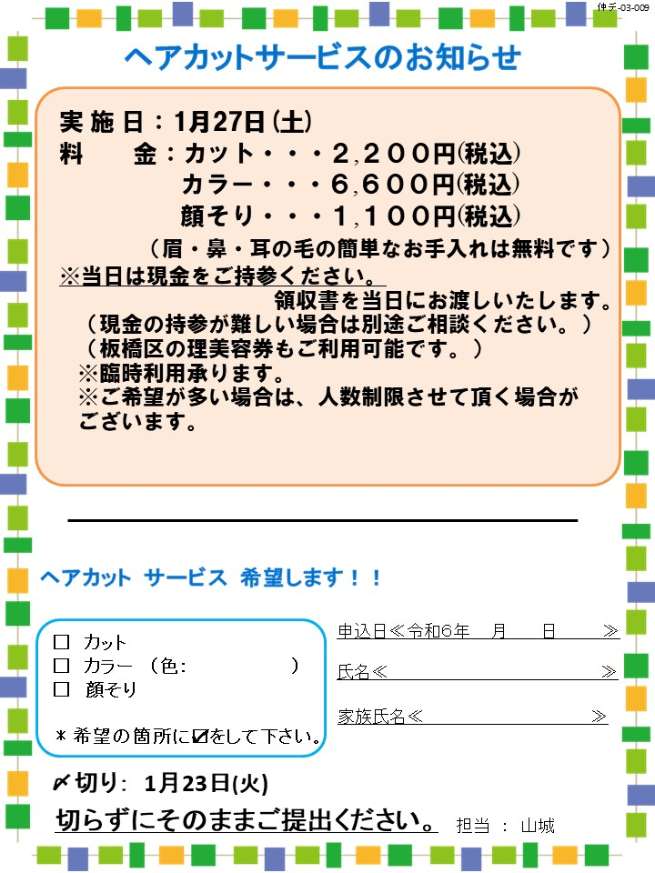 2024.01.08 お知らせ ヘアカットサービスのお知らせ! Tweet シェアする こんばんは~仲町高齢者在宅サービスセンターです! いつも当ホームページをご覧頂きありがとうございます。 前の記事 2024.01.08 お知らせ 【仲町デイ】出前昼食のお知らせ! 次の記事 2024.01.06 お知らせ 【仲町デイ】あけましておめでとうございます!! 一覧へ戻る