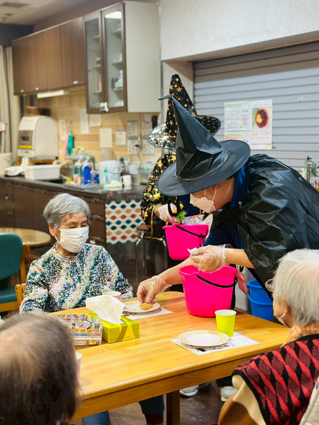 仮装した職員が利用者さんにお菓子をお配りしています♪