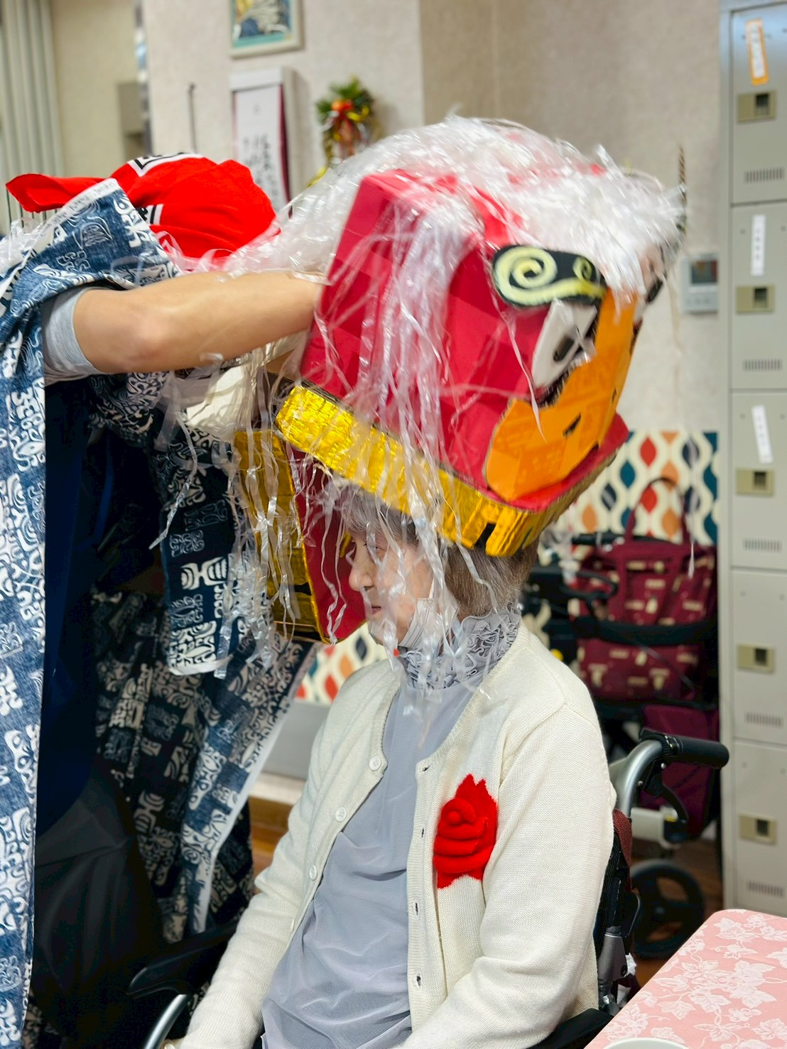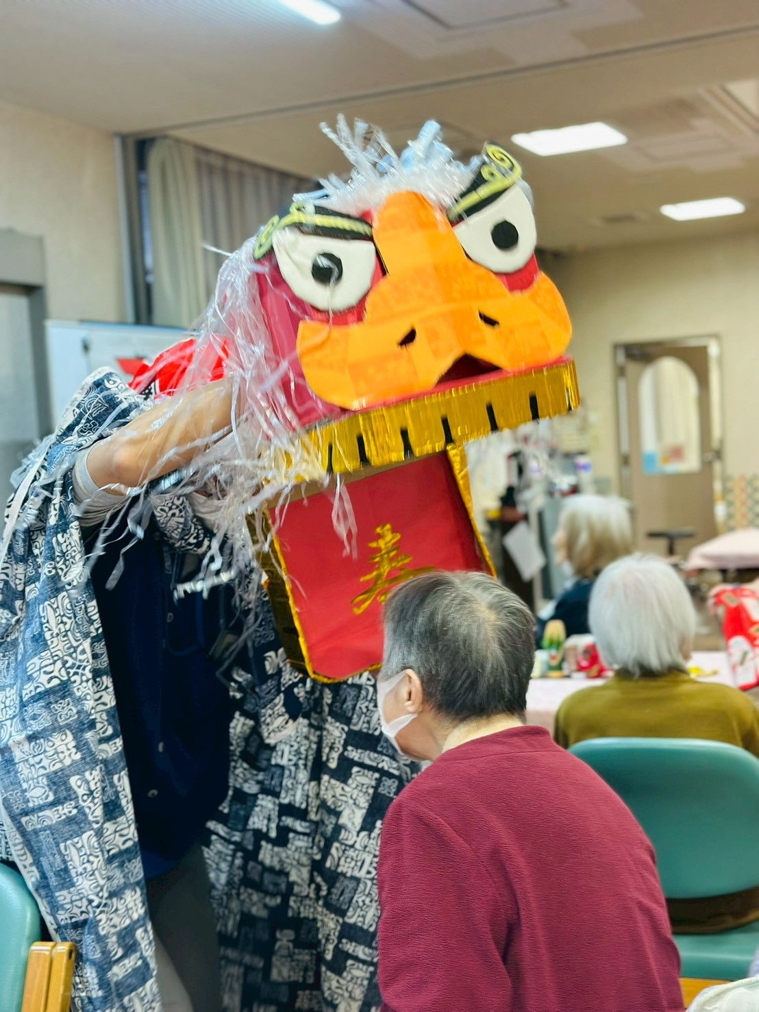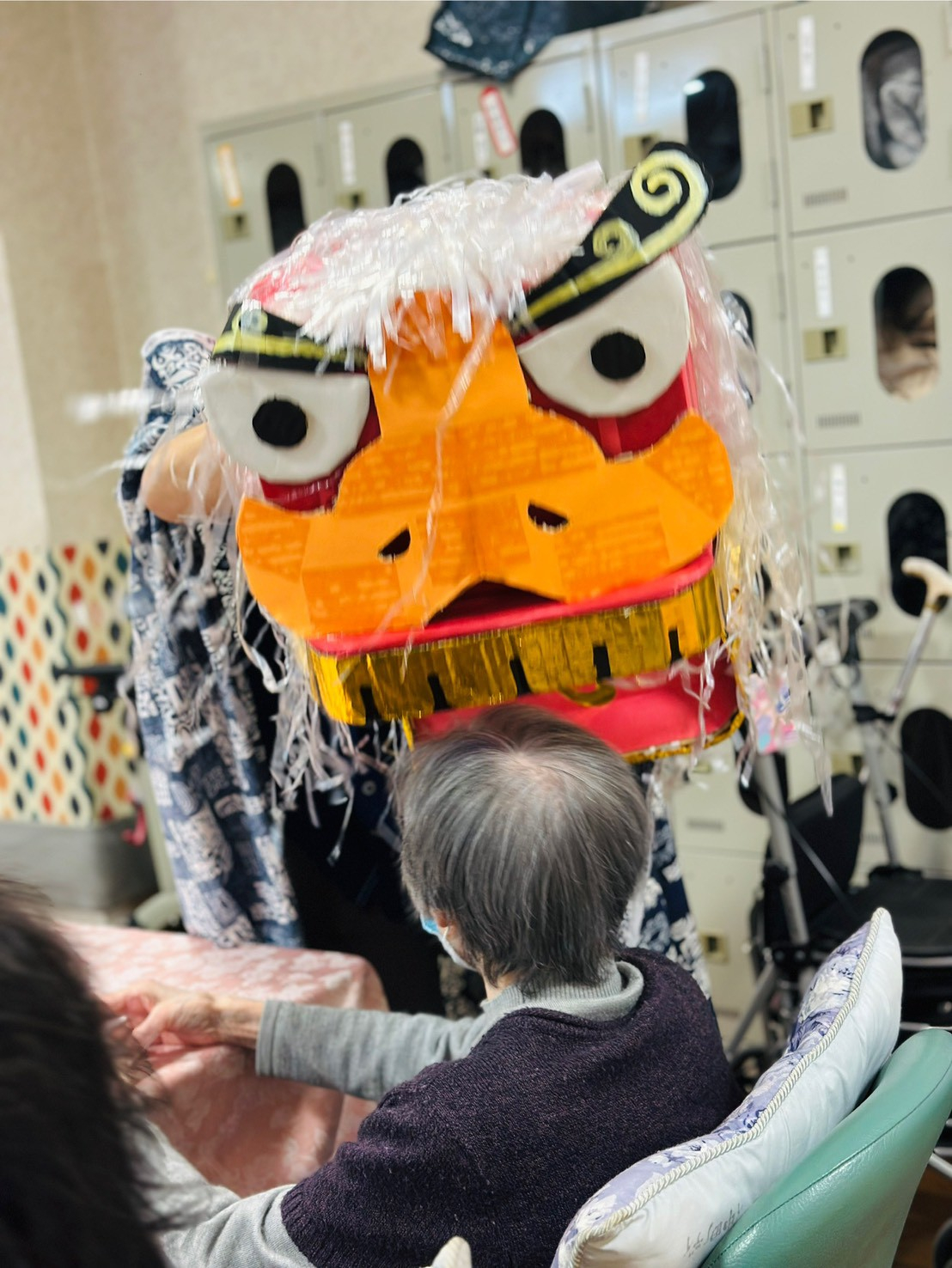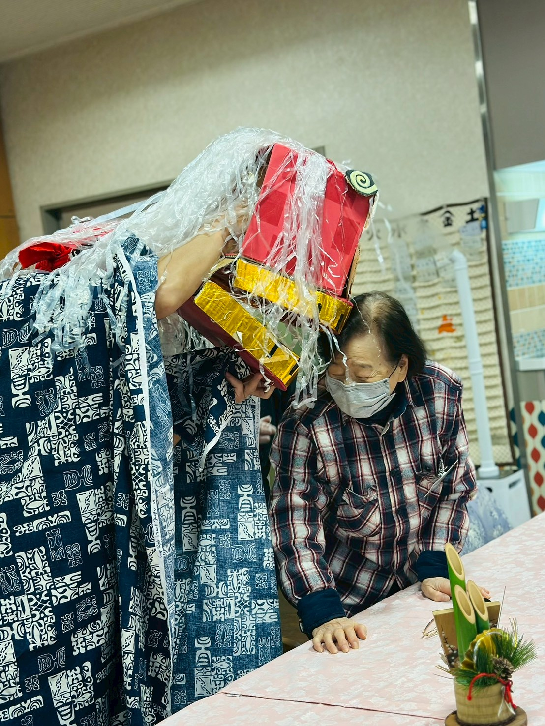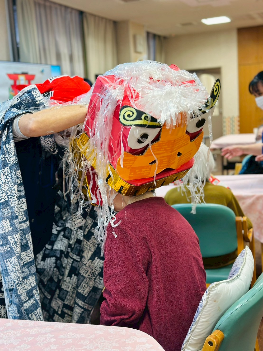 獅子舞の登場、かぶりつきで皆様、慶び、大笑いで、大変楽しい時間でございました。