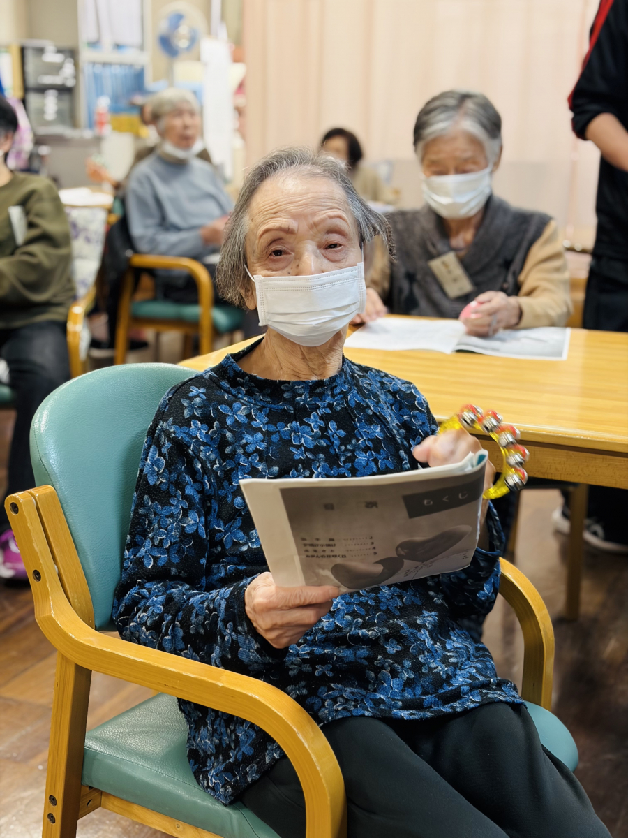 職員のアコーディオン伴奏、ご利用者様はタンバリン、すず、カスタネットを選んでいただき、