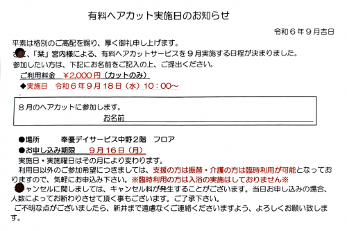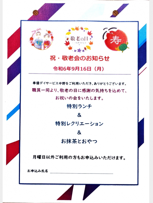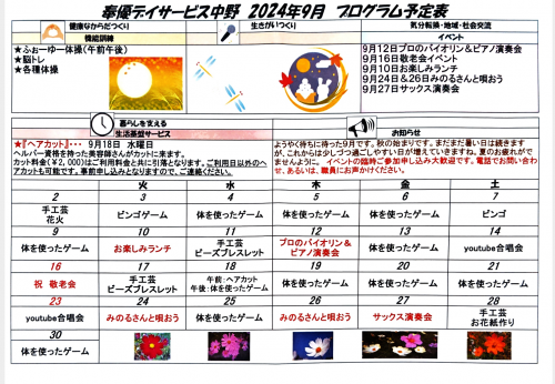 2024.10.12 【中野デイ】デザートバイキング!! 活動報告 2024.10.10 【中野デイ】臨床美術 活動報告 2024.10.05 【中野デイ】手工芸倶楽部 活動報告 2024.10.04 【中野デイ】囲碁。麻雀倶楽部 活動報告 2024.10.03 【中野デイ】運動会のお知らせ! 活動報告 2024.10.02 【中野デイ】玉入れゲーム 活動報告 2024.10.01 【中野デイ】ヘアカットのおしらせ 活動報告 2024.10.01 【中野デイ】10月のプログラム表 活動報告 2024.09.30 【中野デイ】演奏会&31アイスクリーム 活動報告 2024.09.28 【中野デイ】ランチ外出 活動報告 2024.09.27 【中野デイ】サックス演奏会♪ 活動報告 2024.09.26 【中野デイ】デザートバイキング 活動報告 2024.09.26 【中野デイ】みのるさんと唄おう 活動報告 2024.09.24 【中野デイ】手工芸倶楽部 活動報告 2024.09.23 【中野デイ】季節のかわりめ 活動報告 1 … 10 11 12 13 14 … 25