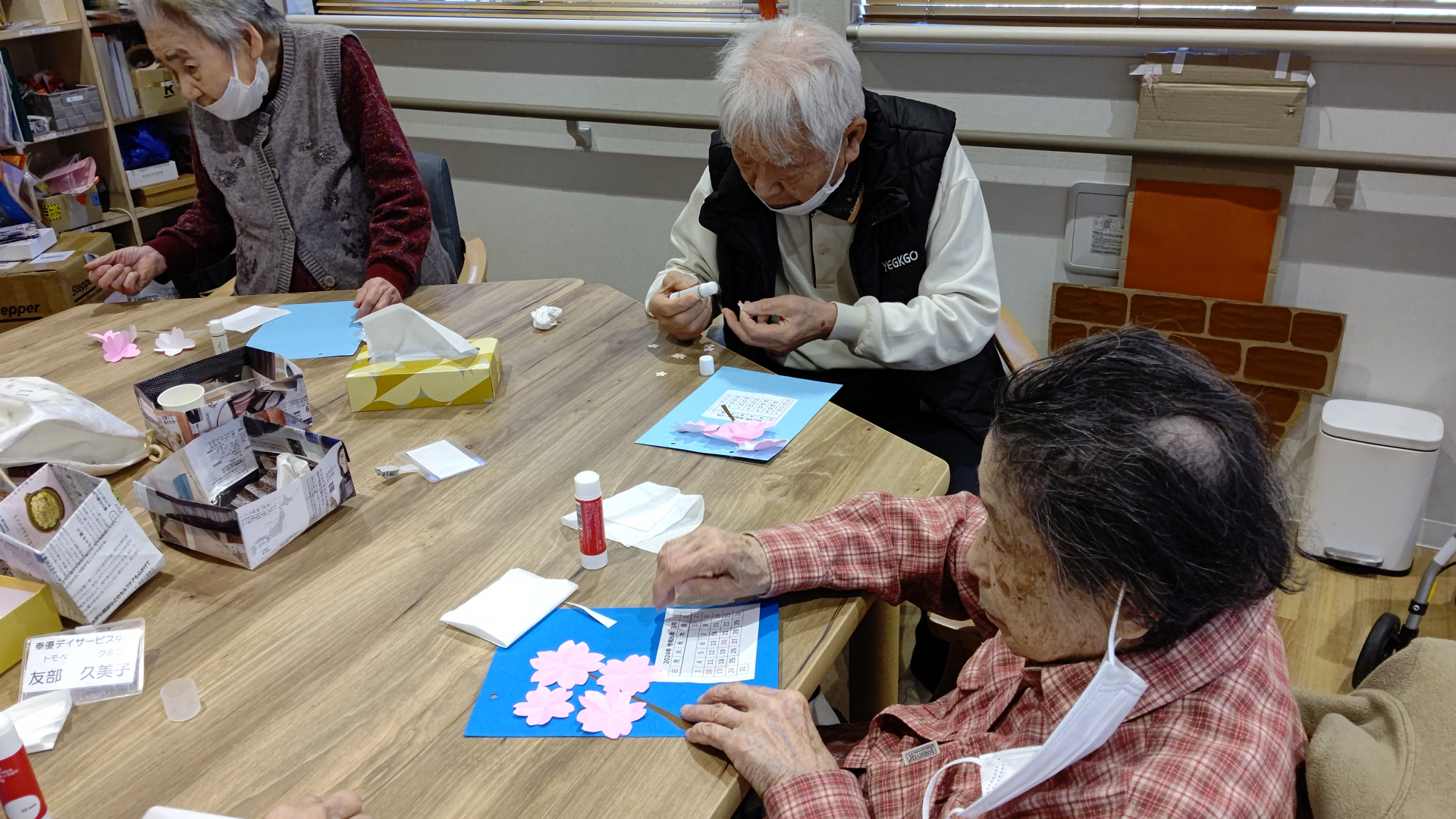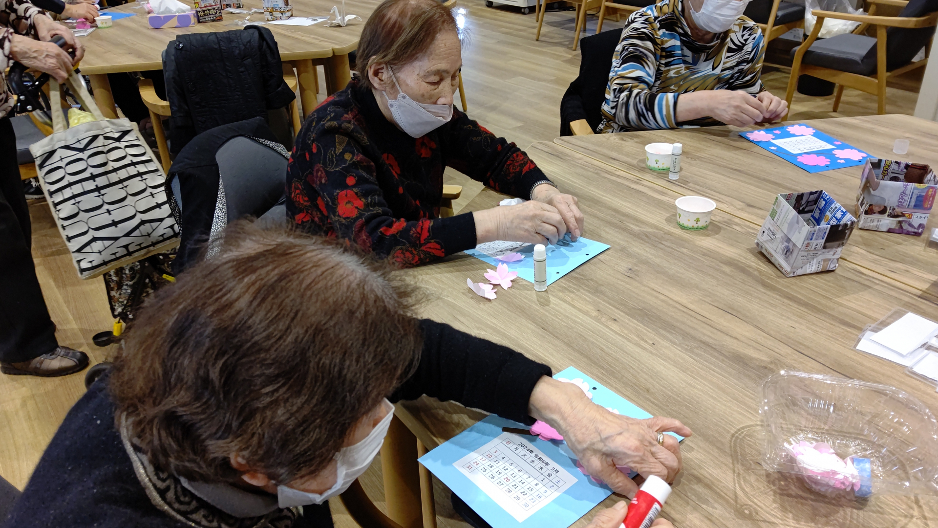 2024.02.28 活動報告 【中野デイ】カレンダー作り Tweet シェアする 本日は3月のカレンダー作りを行いました。 皆様桜の色や配置に個性が出てますね。 桜の開花時期が昔は入学式の時期で、今は卒業式の時期に変わってきてると感じるのは私だけでしょうか、、、。 スベる男より 前の記事 2024.02.29 活動報告 【中野デイ】輪投げ&デザートバイキング 次の記事 2024.02.26 活動報告 【中野デイ】壁紙つくり(梅の花) 一覧へ戻る