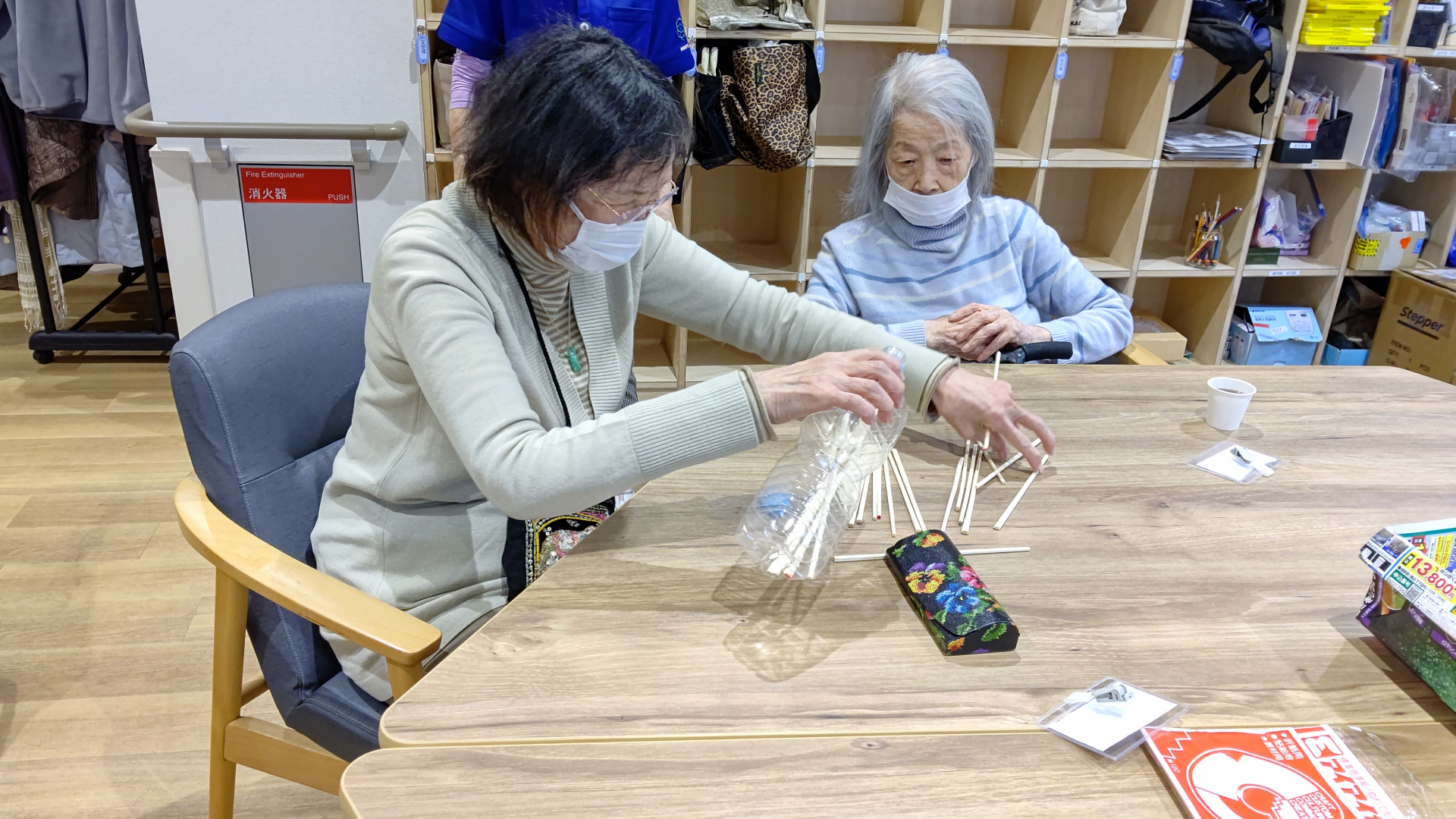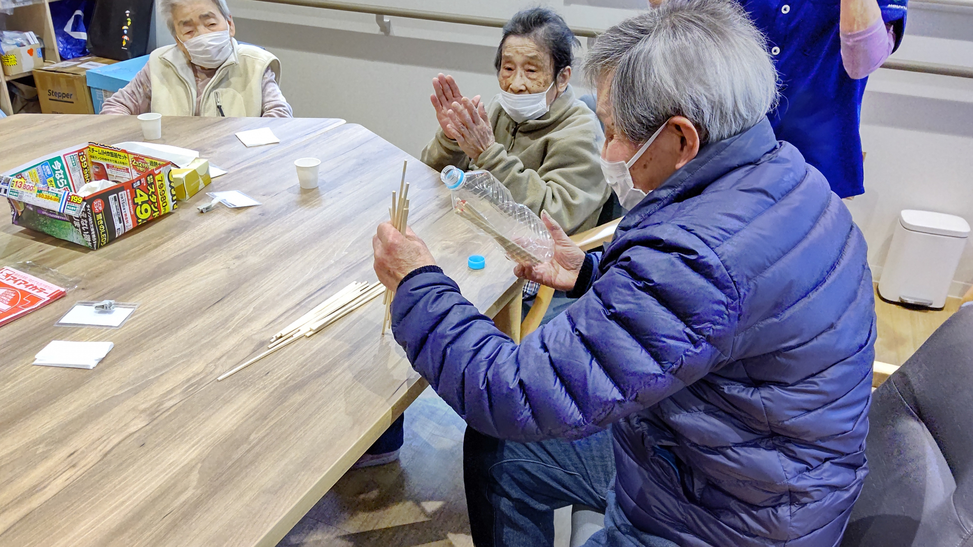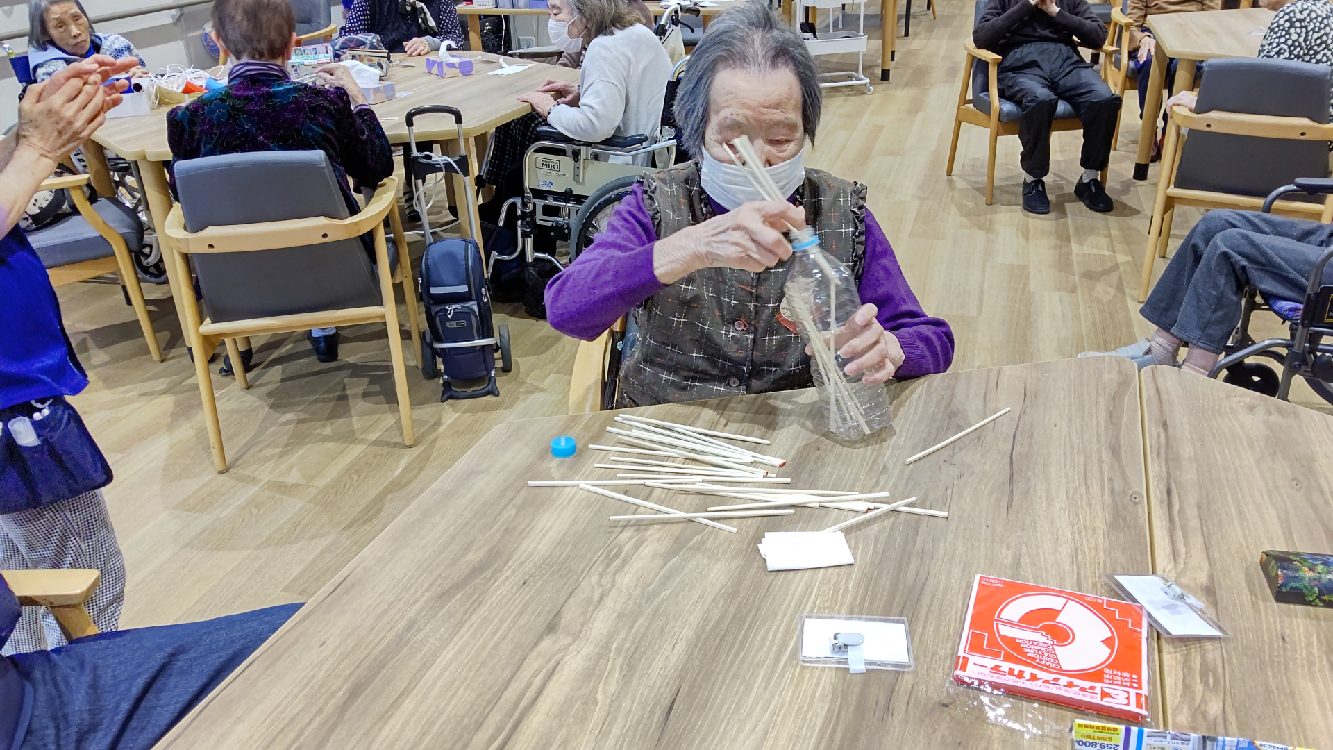 本日の上肢筋力トレーニングは割りばし出し入れゲームです。手先、指先をしっかり使い、ペットボトルへ割ばしを出し入れします。それをチーム合計タイムの早いチーム順で競いました!!