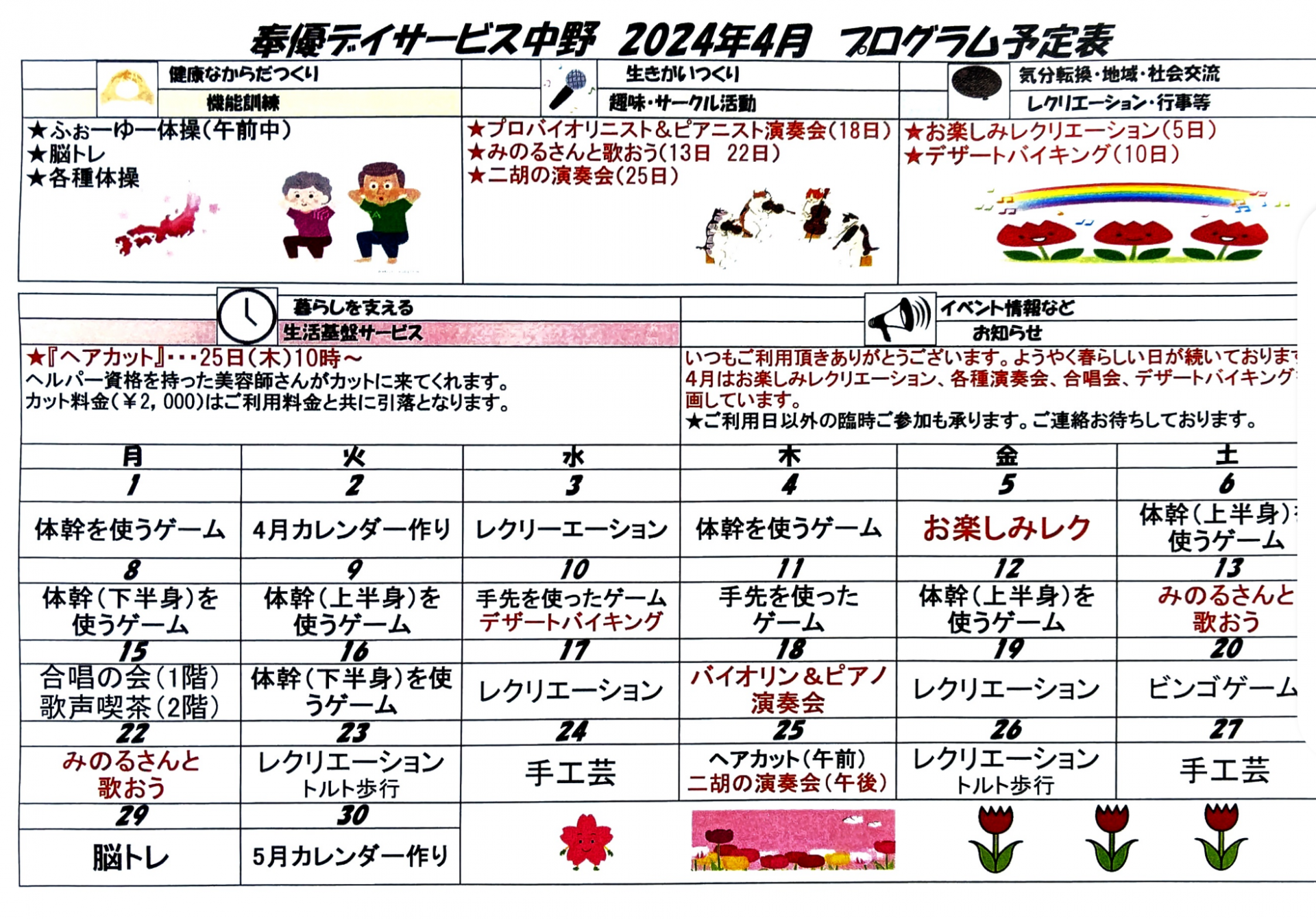 2024.04.01 活動報告 【中野デイ】4月プログラム表 Tweet シェアする お待たせしました!!4月のプログラム予定表が完成しました!! 様々なレクや外出イベント予定していますのでご期待ください。 奉優デイサービス中野 前の記事 2024.04.01 活動報告 【中野デイ】射的ゲーム 次の記事 2024.04.01 活動報告 【中野デイ】ヘアーカットのお知らせ 一覧へ戻る