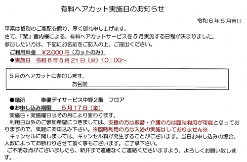 2024.05.02 活動報告 【中野デイ】5月プログラム表!! Tweet シェアする お待たせしました!!5月のプログラム予定表が完成しました。 様々なレクレーションやボランティア&演奏会♪の予定しております。 奉優デイサービス中野 前の記事 2024.05.03 活動報告 【中野デイ】みのるさんと歌おう!! 次の記事 2024.05.01 活動報告 【中野デイ】ヘアカットのお知らせ!! 一覧へ戻る