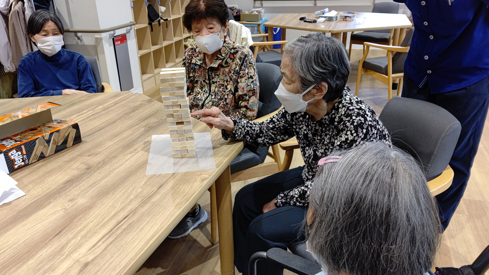 合唱会に参加されなかった方々はデイルームで「ジェンガ」を楽しまれていました。