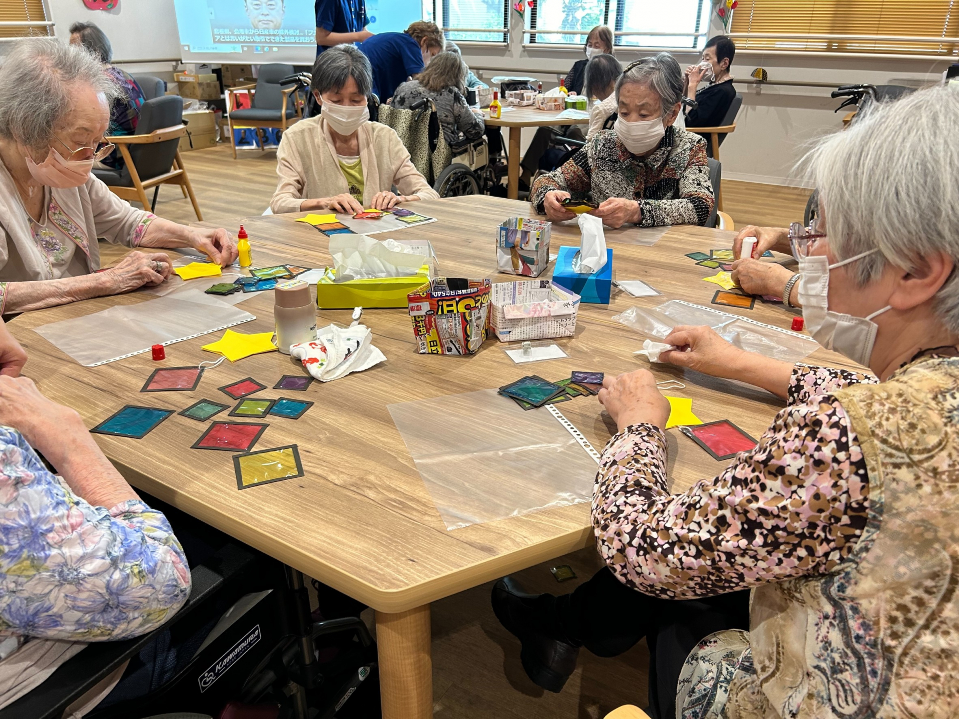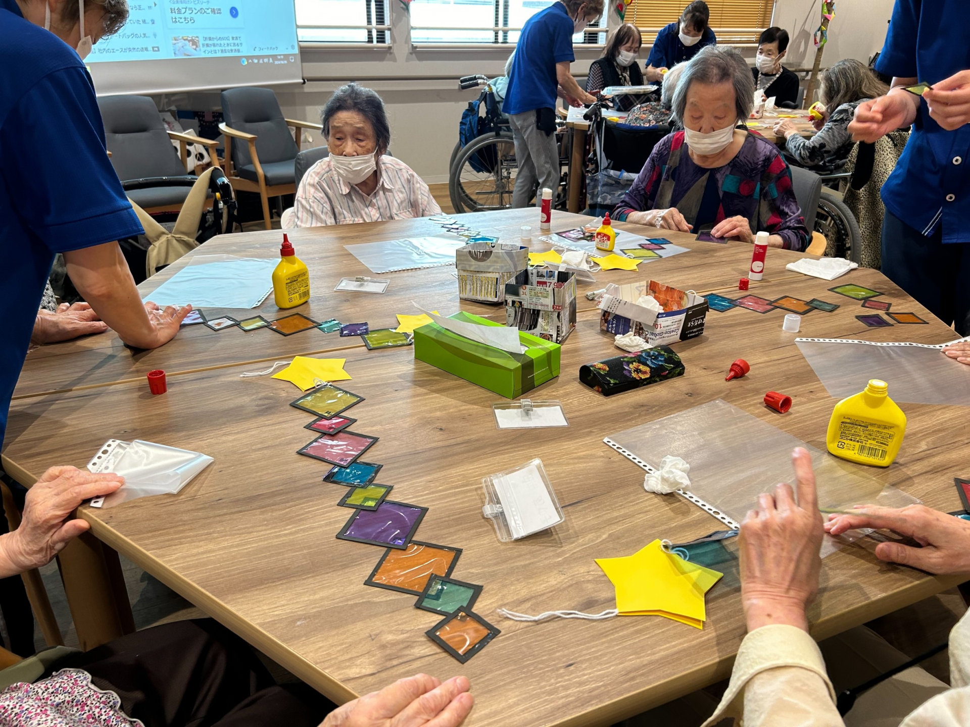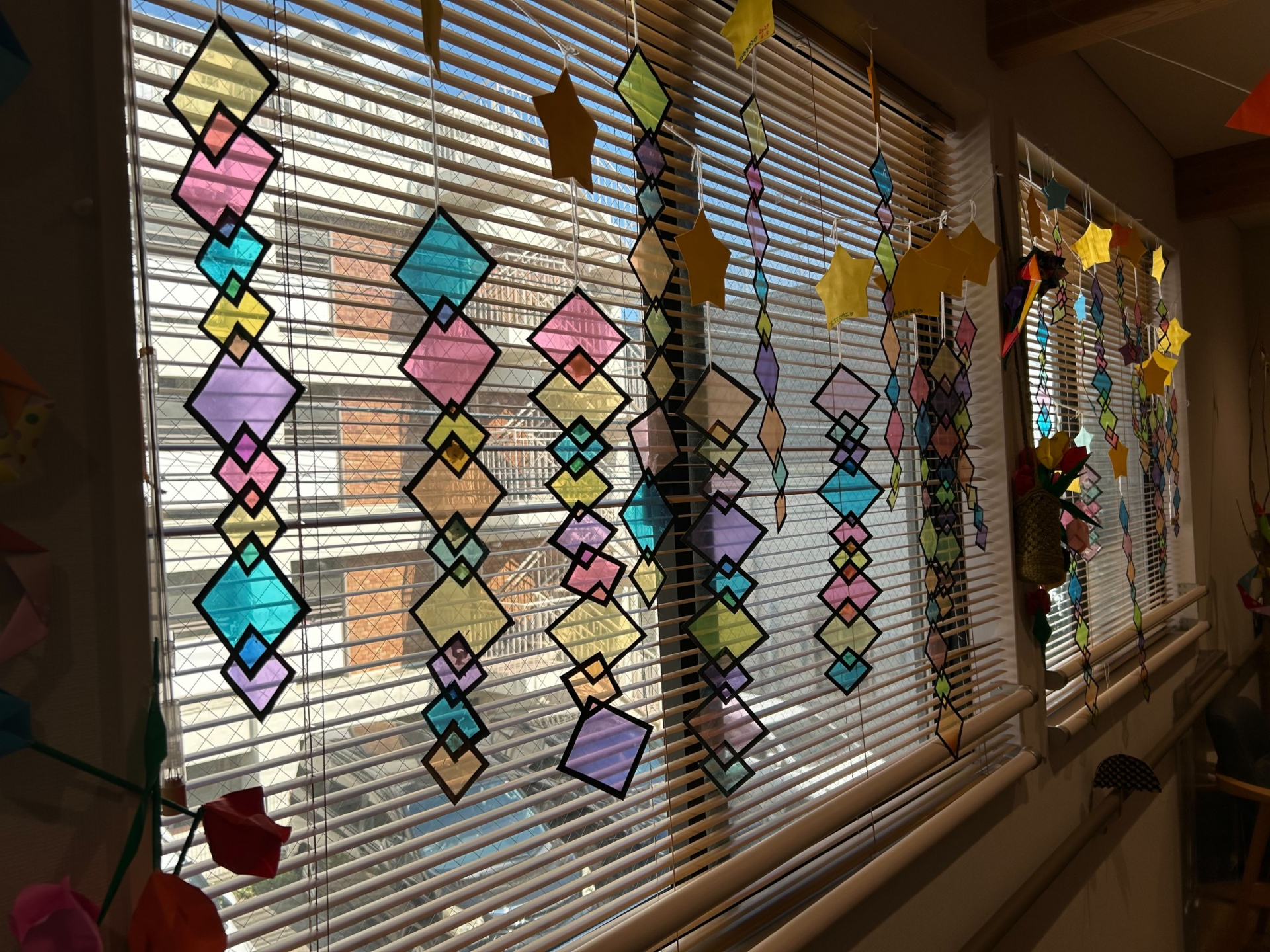 2024.06.05 活動報告 【中野デイ】ステンドグラス風七夕飾り Tweet シェアする 本日は「七夕飾り」をステンドグラス風にアレンジして作成しました。 皆様で作って頂いた七夕飾りを窓ガラスに展示しました。↓↓↓↓ 奉優デイサービス中野 前の記事 2024.06.06 活動報告 【中野デイ】トルト実施日!! 次の記事 2024.06.04 活動報告 【中野デイ】上肢筋力トレーニング! 一覧へ戻る