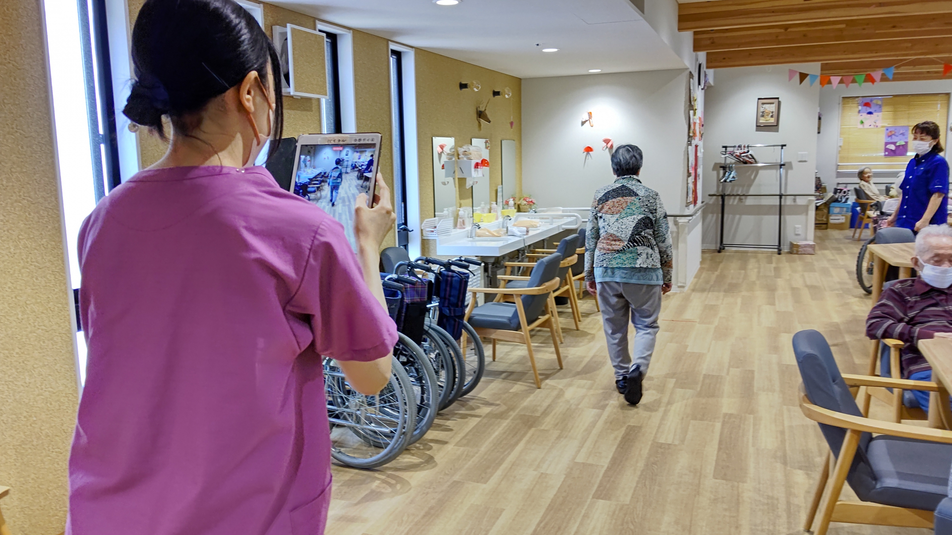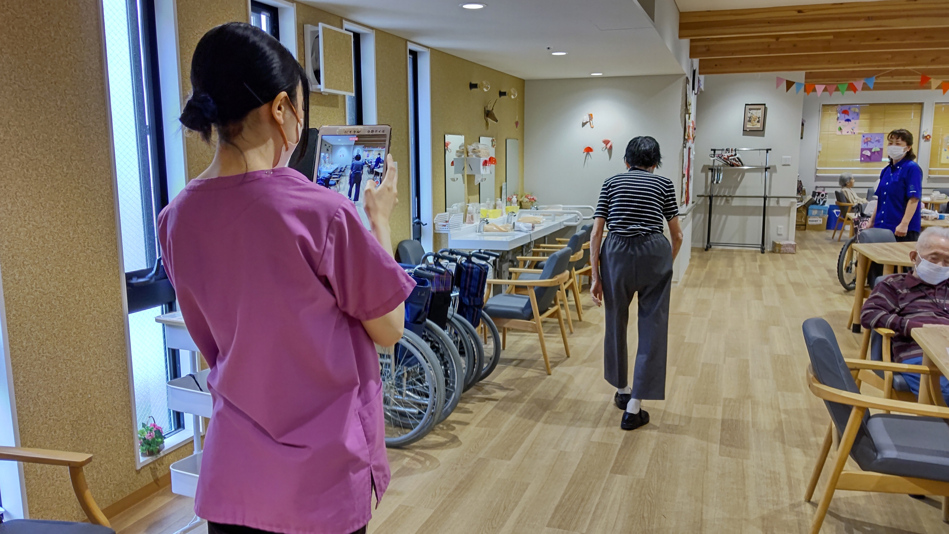 iPadでご利用者様の歩行動作を撮る事で歩容や転倒リスクを評価してくれる大事な情報です。