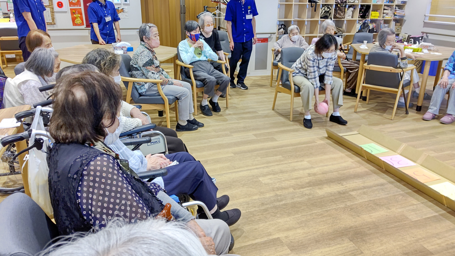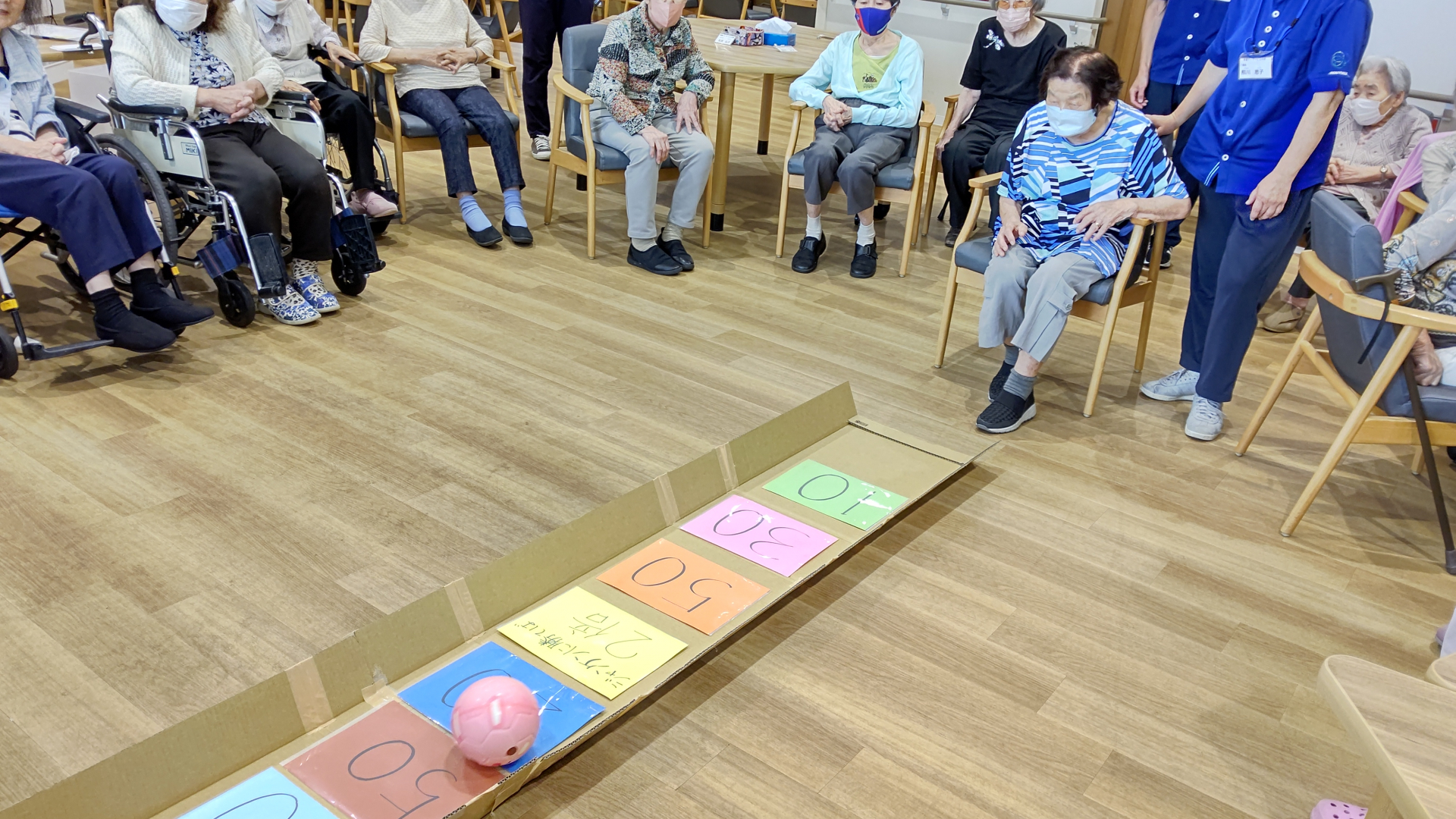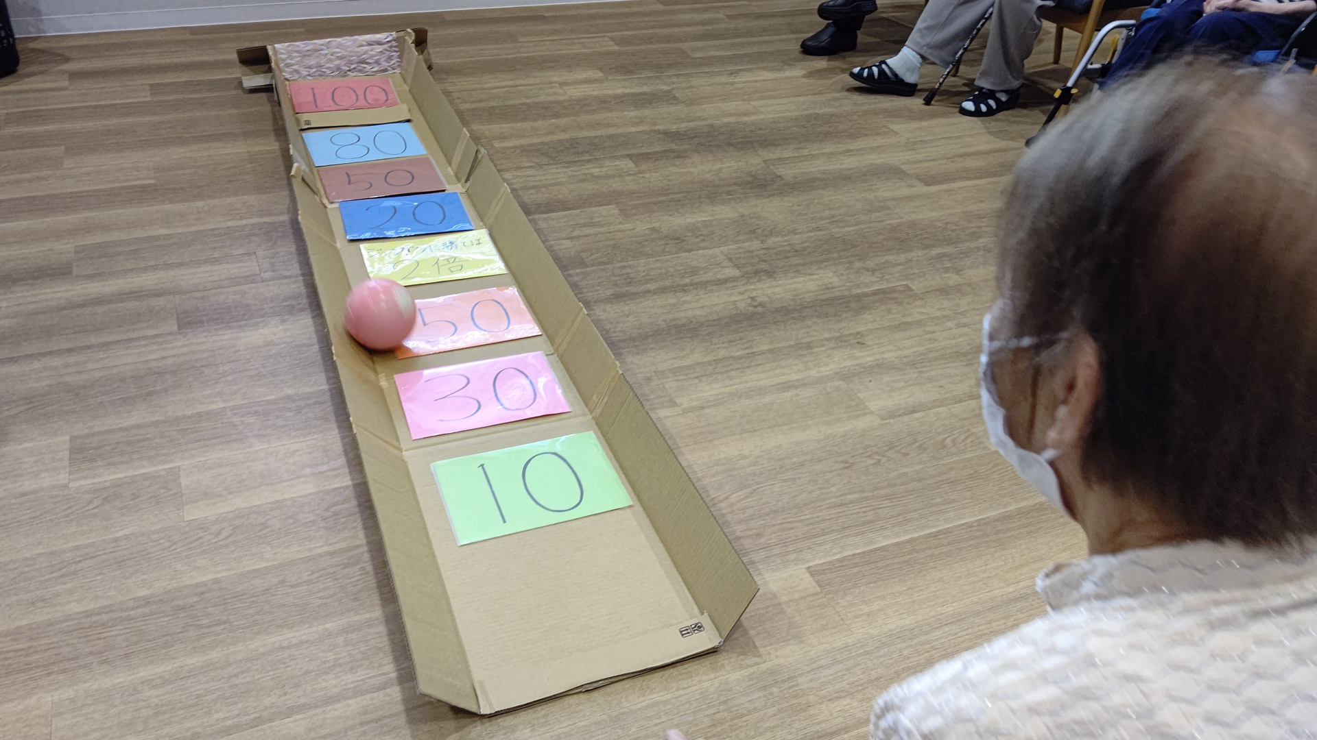 数字の付いた紙の下にボールが止まったらそれが得点になりますが、ボーナスチャンスがあり、職員とじゃんけんをして勝ったら獲得点数の2倍4倍にハネ上がるルールです。