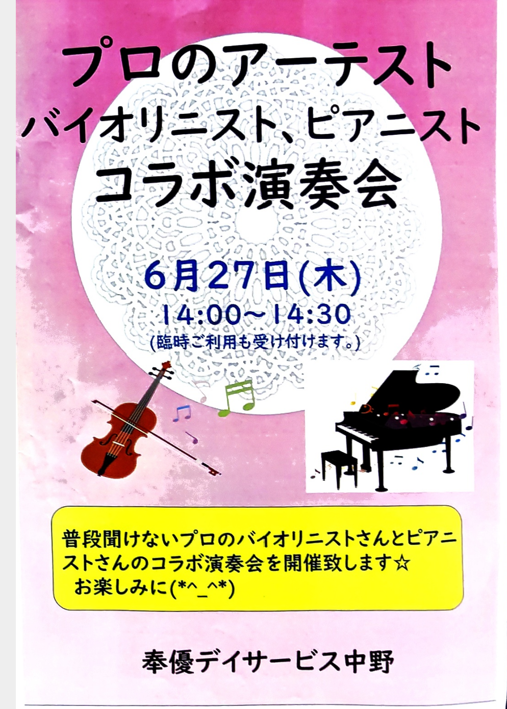 6月27日(木)にプロのバイオリニストとピアニストによるコラボ演奏会が実施されます。デイ2Fフロアにて14:00~14:30の間で実施されます。滅多にないプロのコラボ演奏会、是非お越しください。臨時利用受付けていまーす。お早めにご連絡を!!!