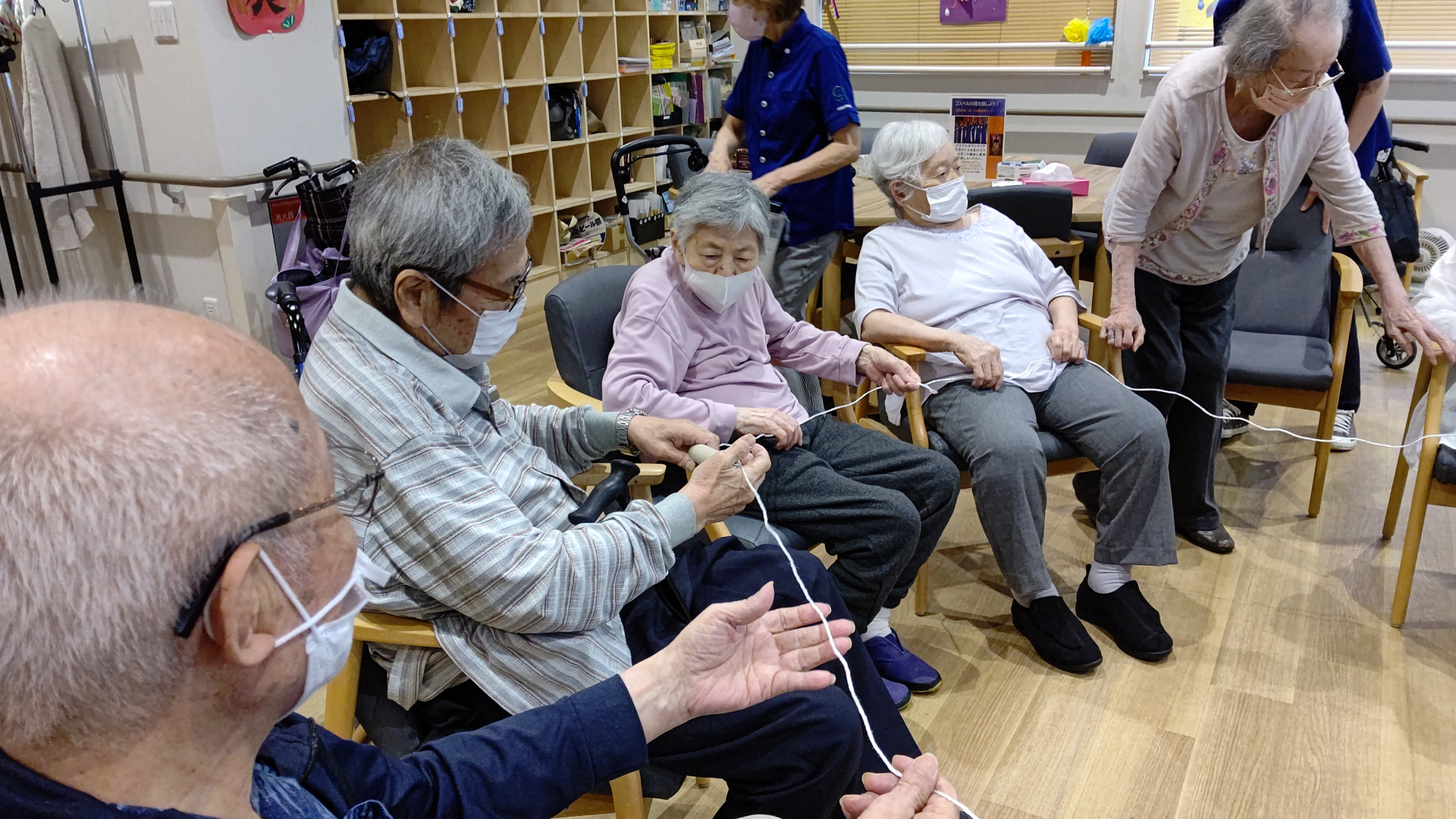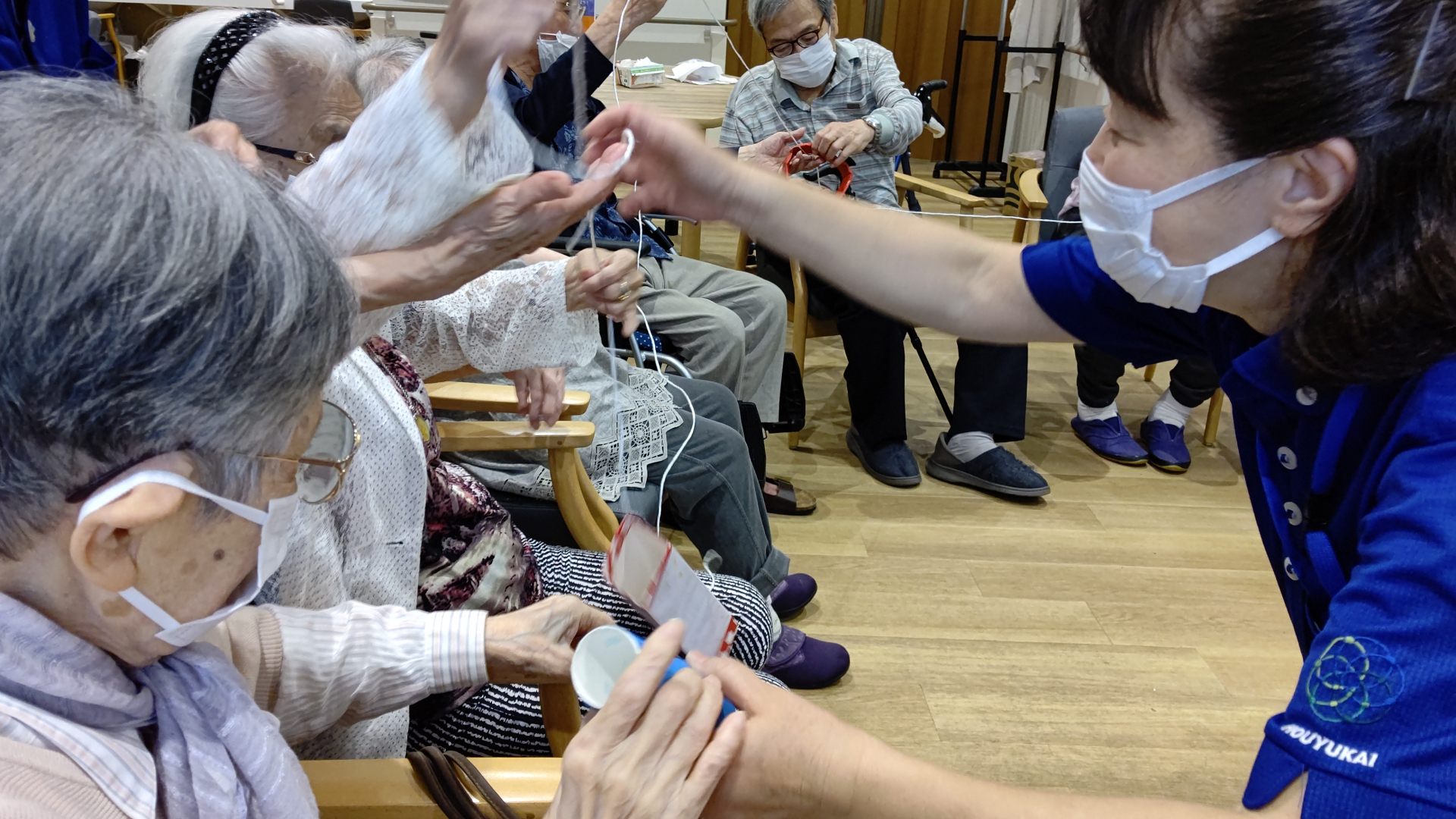 色々な形の物をひもに通して回していくゲームですが、全員のコミュニケーションが取れないとスムーズに物が運ばれませんね。