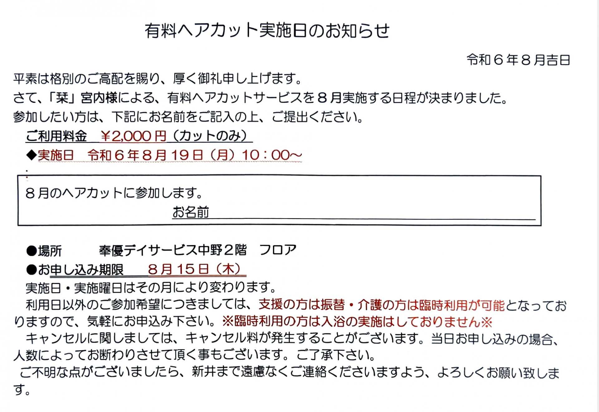 2024.08.01 活動報告 【中野デイ】ヘアカットのお知らせ Tweet シェアする お待たせしました!!8月のヘアカット実施日は19日(月)に決定しました。 利用日以外の参加希望者は臨時利用、振替利用になりますが、お気軽に相談頂ければと思います。 奉優デイサービス中野 前の記事 2024.08.01 活動報告 【中野デイ】8月プログラム予定表 次の記事 2024.07.31 活動報告 【中野デイ】サックス演奏会♪ 一覧へ戻る
