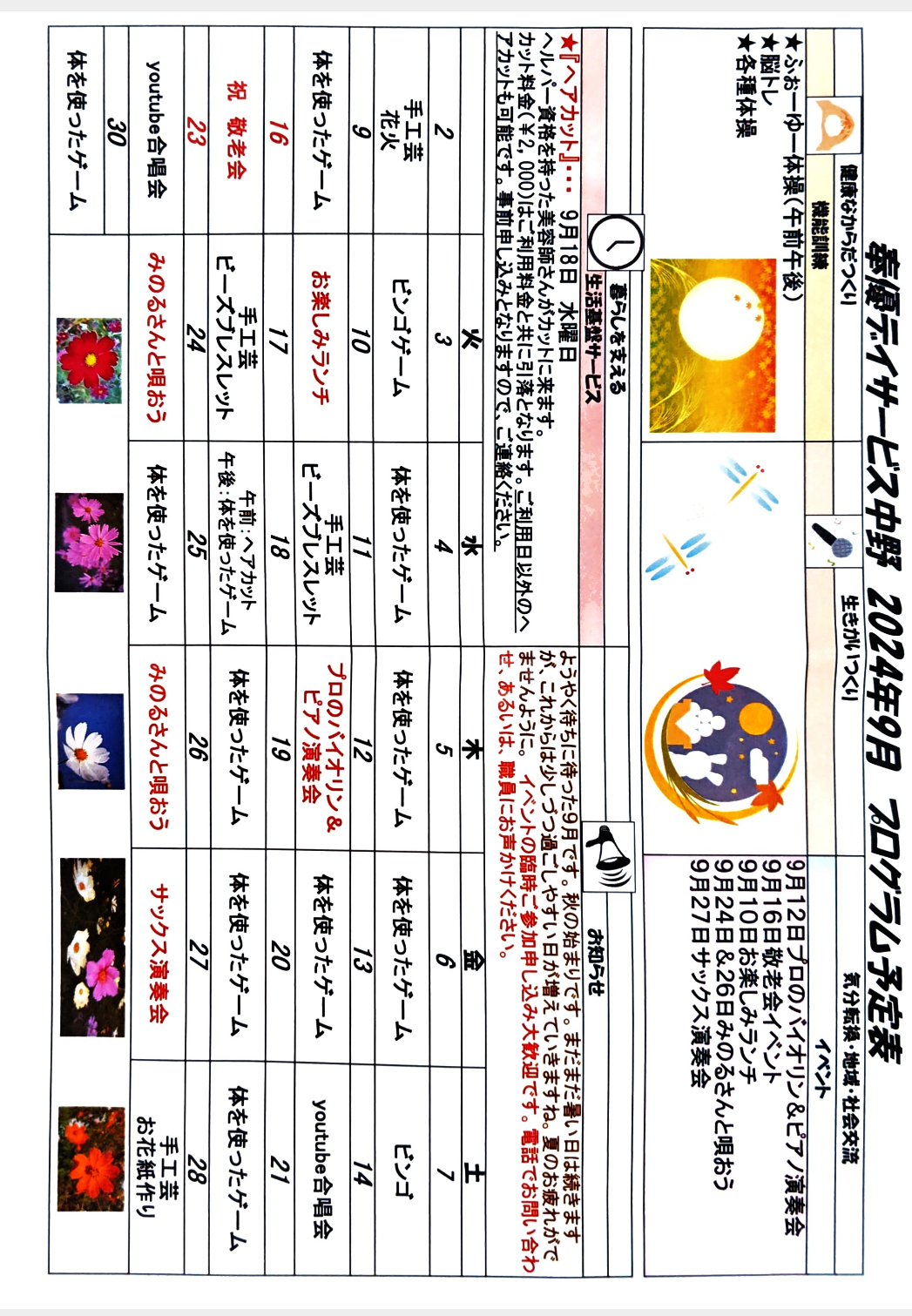 今月は敬老祭、演奏会、お楽しみランチ等たくさんのイベントが目白押しです。臨時利用、振替利用、どんどん参加をお待ちしております。