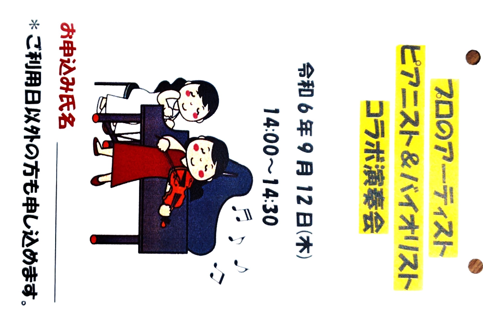 毎回人気のプロのバイオリストとピアニストによるコラボ演奏会が9月12日(木)に実施が決定いたしました。滅多に見れないプロの演奏会に是非お越しください。