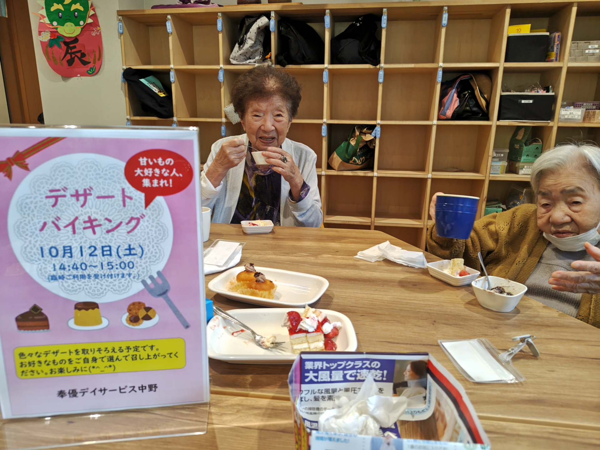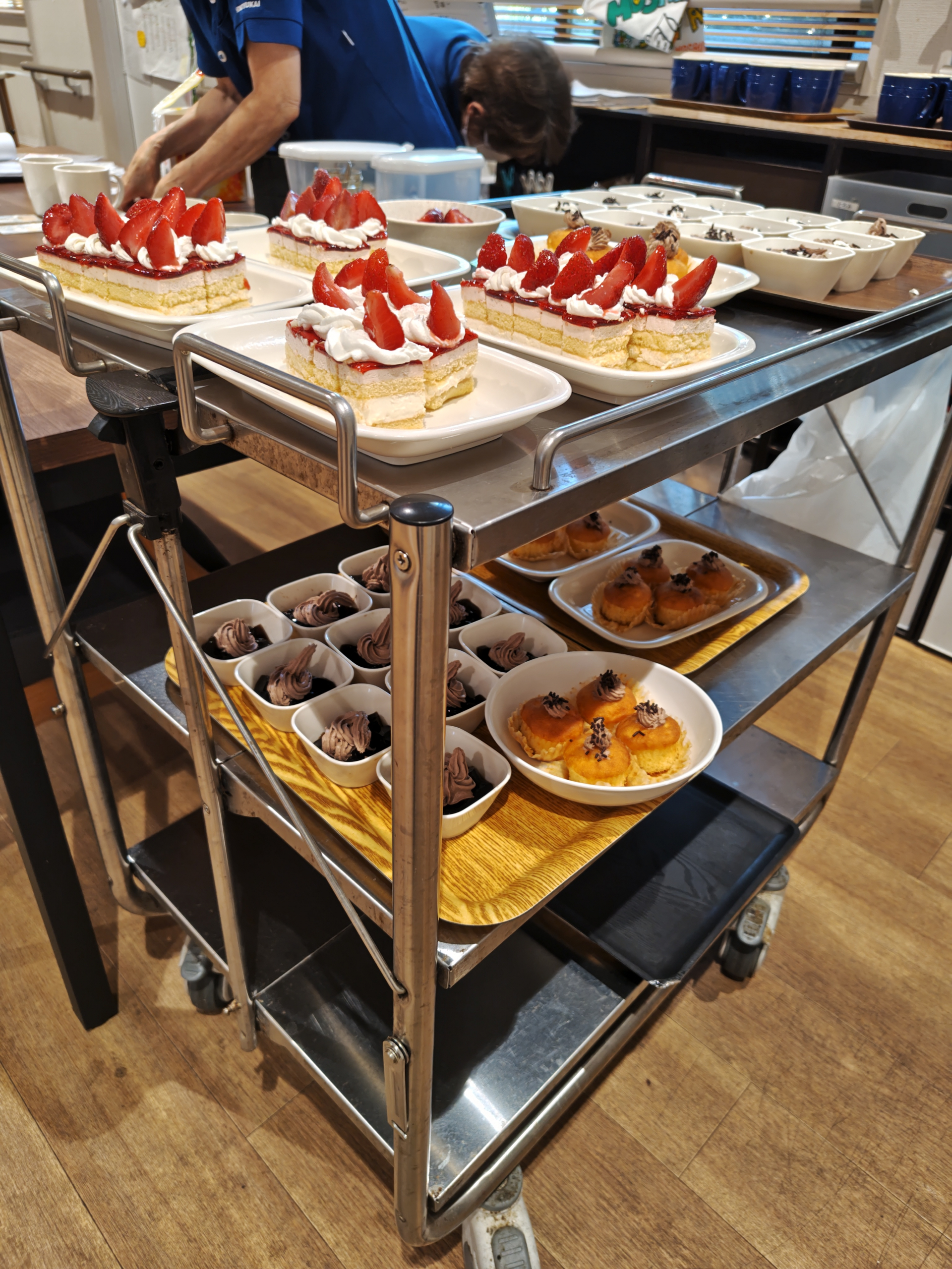 本日のレクの後のおやつはケーキバイキングを実施しました。 職員の下準備も終わりもうすぐ始まります。