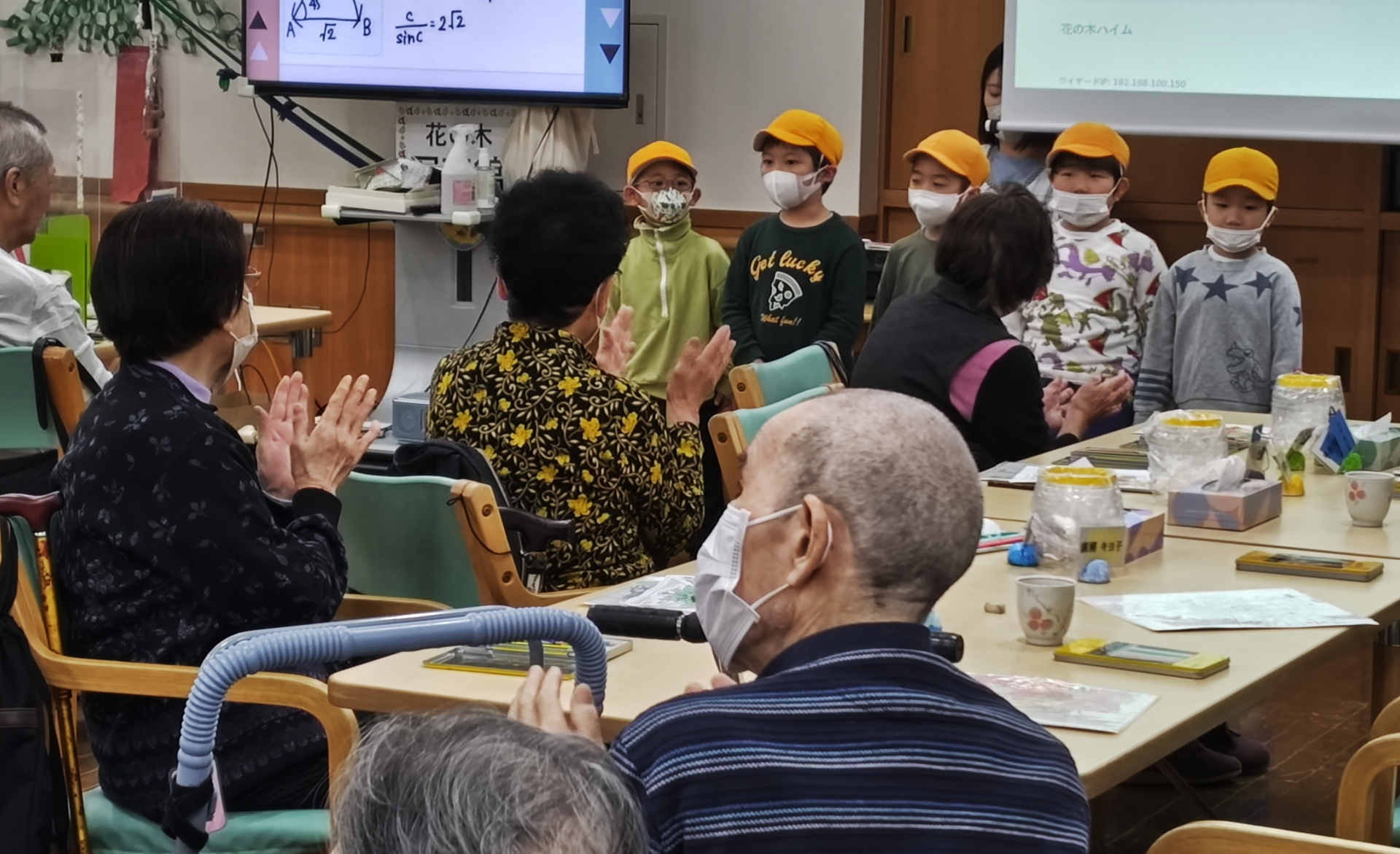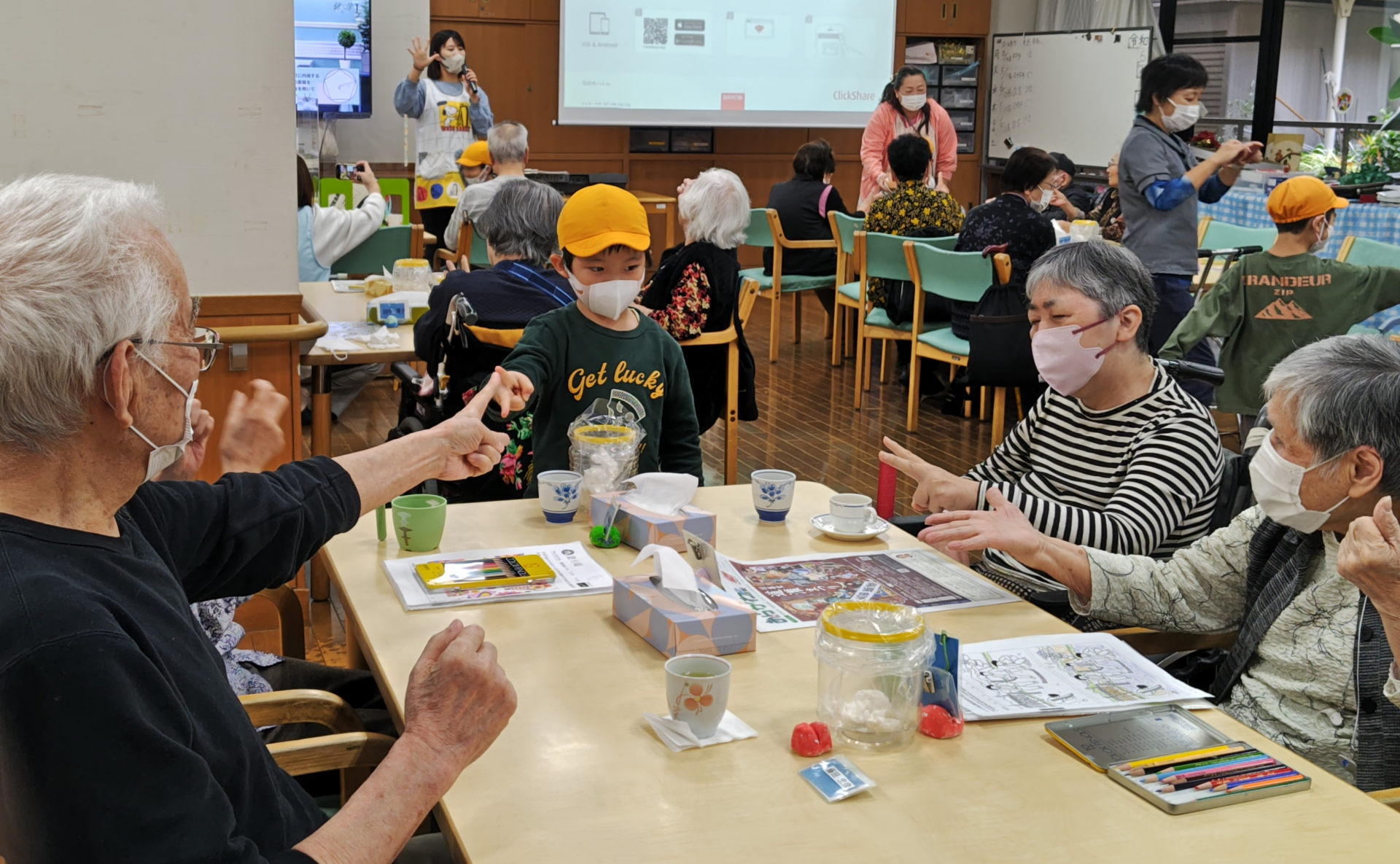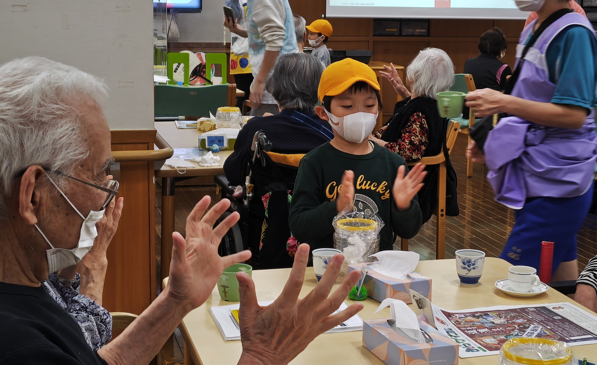 園児が各テーブルでお遊びを披露して、それを見ていたご利用者様が穏やかな笑みでみていらっしゃいました。