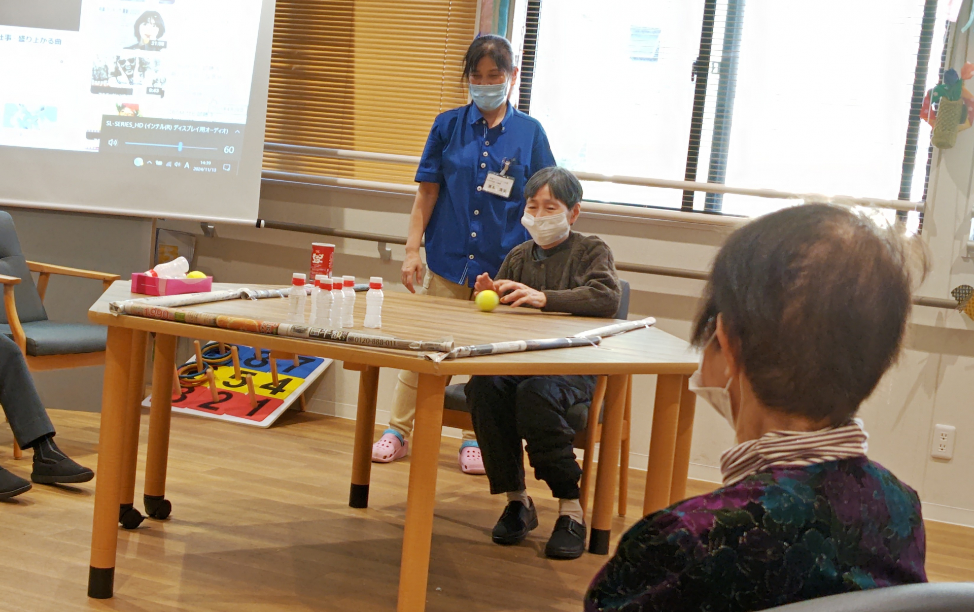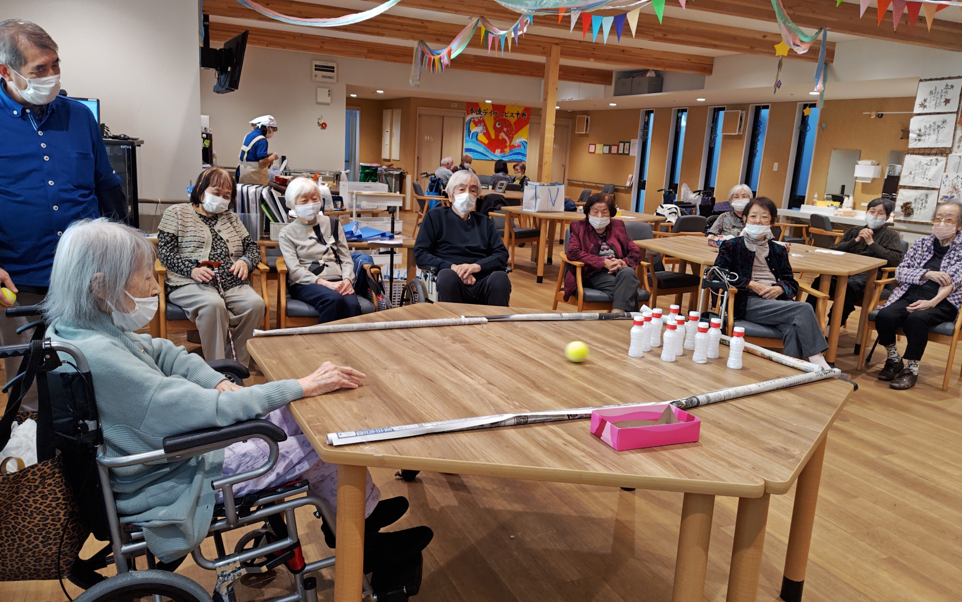 本日の上肢筋力強化ゲームは「テーブルボーリング」を実施しました。