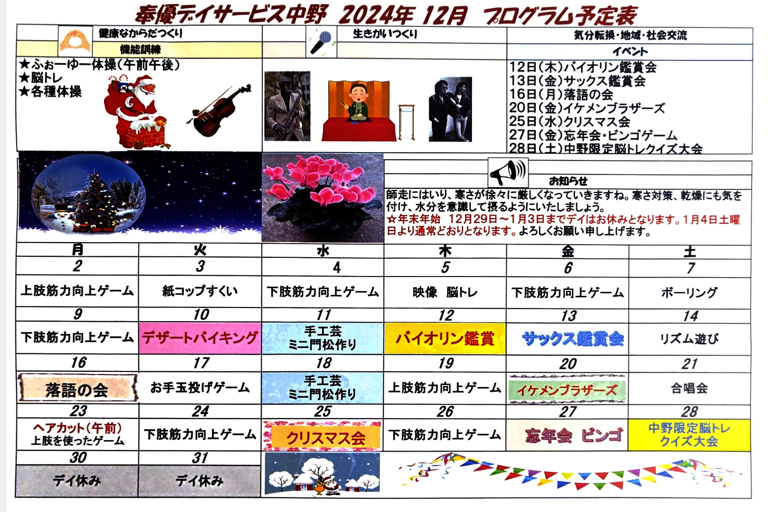 お待たせしました”!!12月のプログラム表が完成しました。12月も11月に続き様々なイベントを企画しております。臨時利用、振替利用のお問い合わせにはお気軽にご相談下さい。