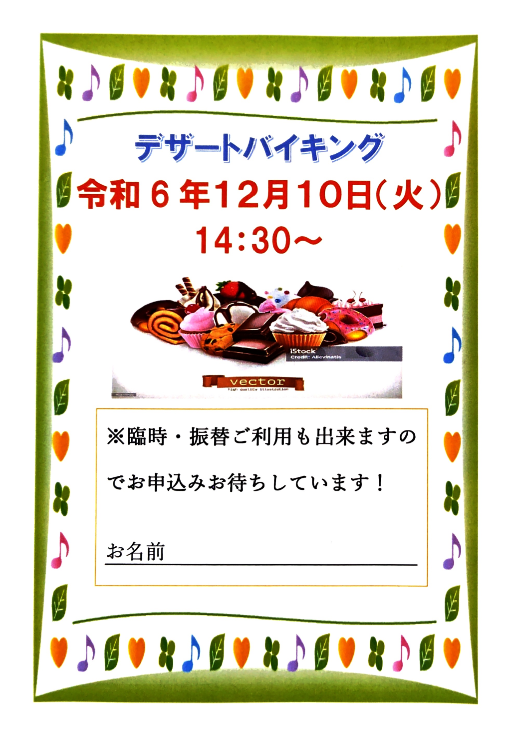 2024.12.02 活動報告 イベントのお知らせ ① Tweet シェアする 人気のデザートバイキングのお知らせ!!です。10日(火)14:30~です。 奉優デイサービス中野 T 前の記事 2024.12.02 活動報告 【中野デイ】イベントのお知らせ ② 次の記事 2024.12.02 活動報告 【中野デイ】ストラックアウト! 一覧へ戻る