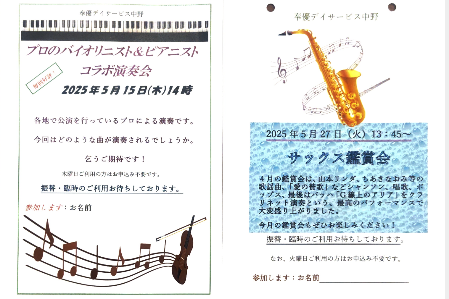 第3弾は15日(木)14:00~プロのバイオリスト&ピアニストのコラボ演奏会♪が開催されます。第4弾は27日(火)人気のサックス演奏会♪が開催されます。