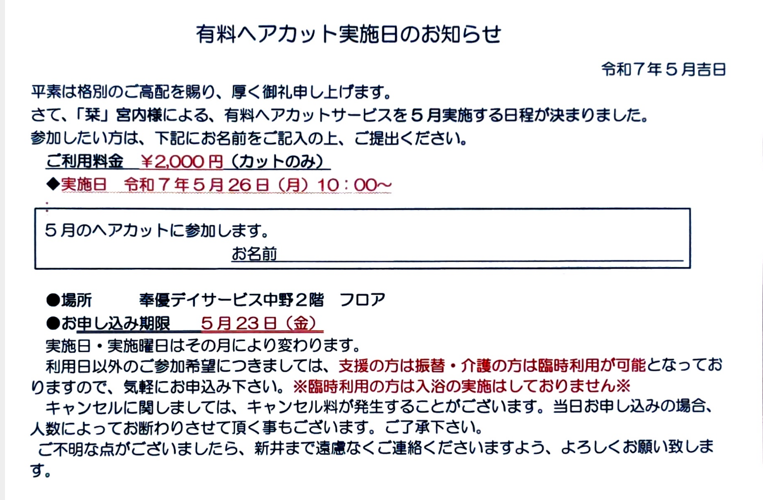 お待たせしました!!イベントではありませんが、5月のヘアカットサービスは26日(月)10:00~実施されます。