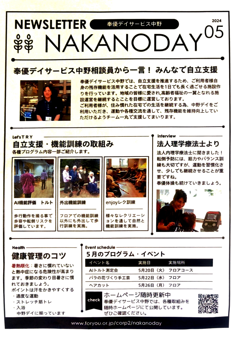 奉優デイサービス中野では、日々の活動内容、イベント、手工芸、レクリエーションをSNS(ティックトック、ブロブ、インスタ)発信しています。 自立支援、機能訓練に取り組んでおり、健康管理のコツや5月のプログラム、イベントを実施しています。