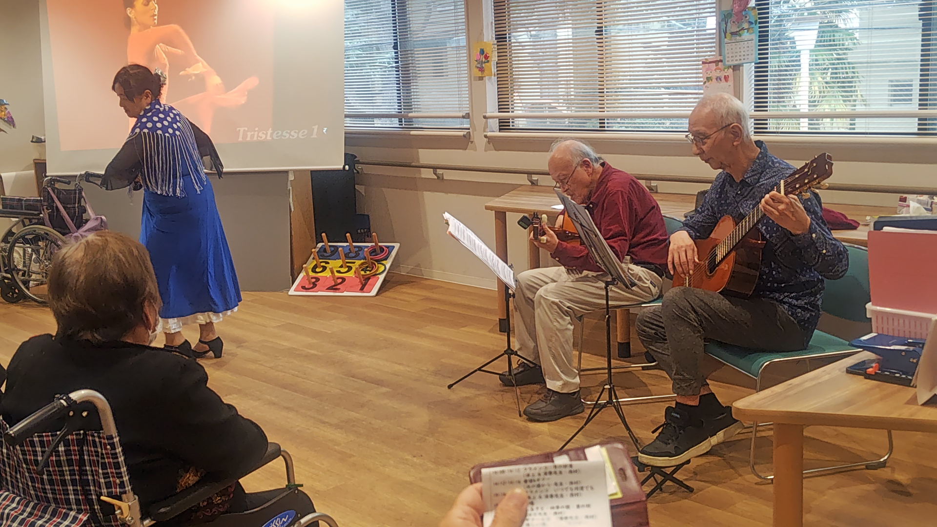 ギター演奏の男性は77歳と88歳の方でフラメンコの女性の着替えの際は色々演奏して頂きました。映画音楽等、有名な曲を演奏して頂き、ご利用者様も喜ばれていました。