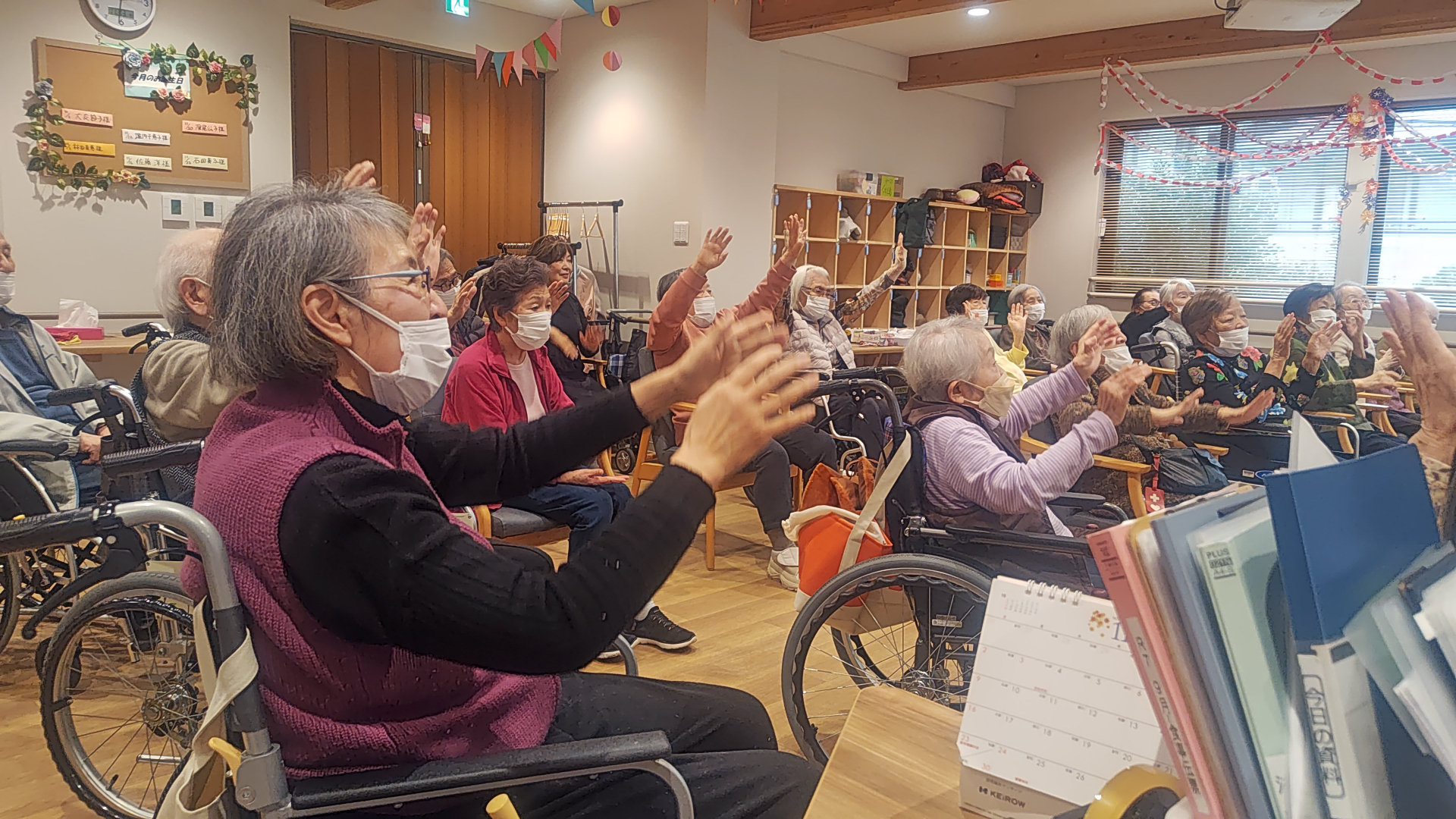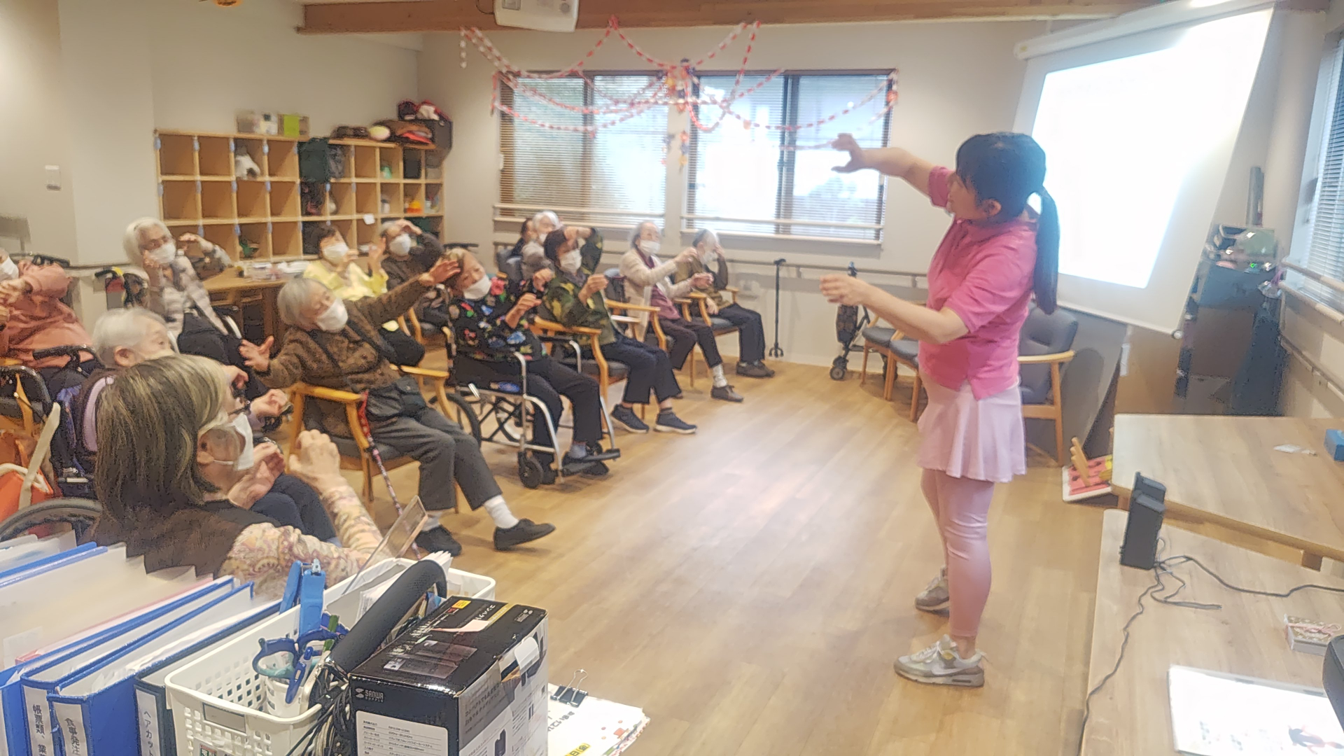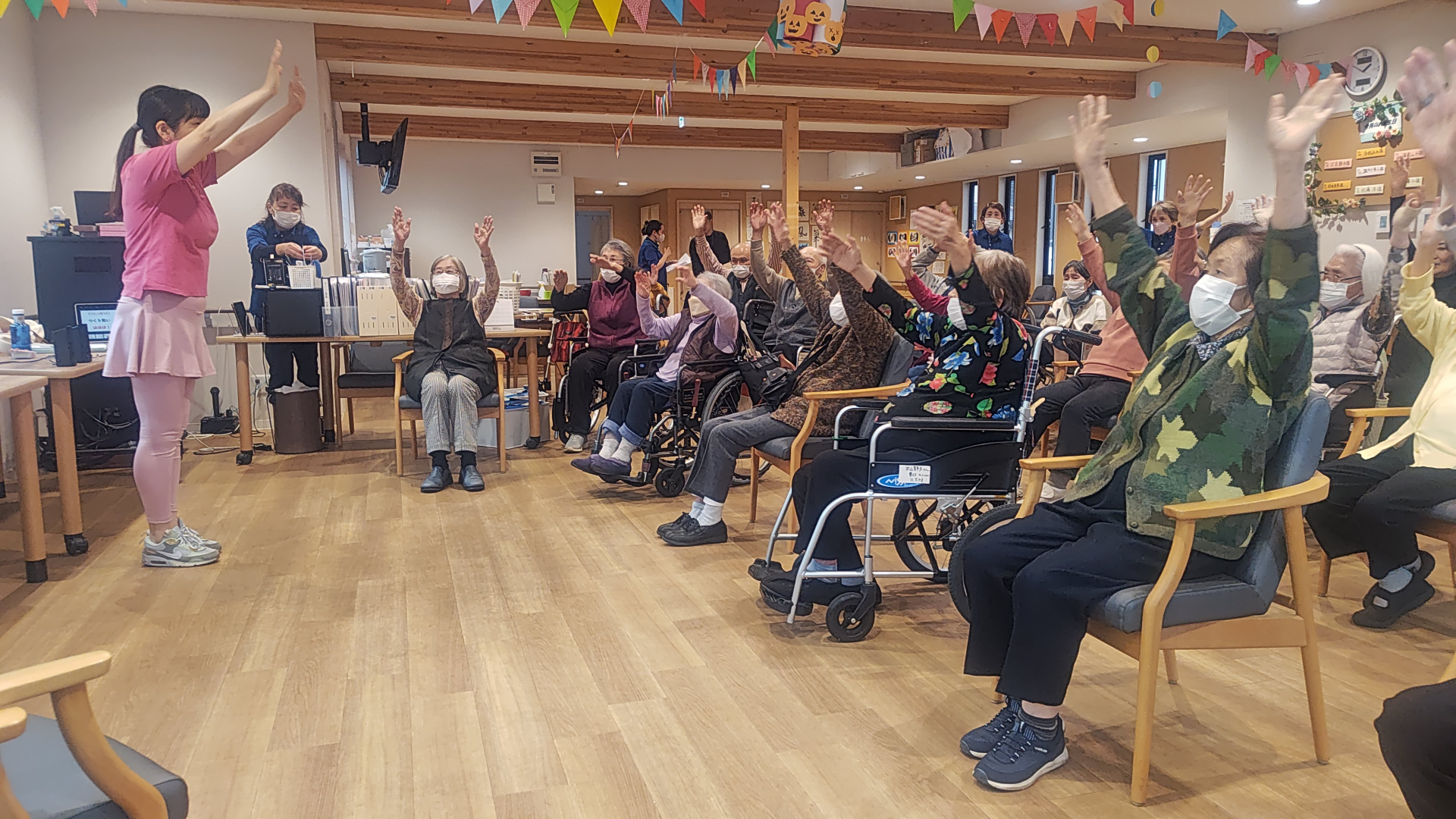 皆様色々なワードを言った後に笑ったり、様々なラフターエクササイズを皆様と実践してデイルームが笑いに包まれていました。