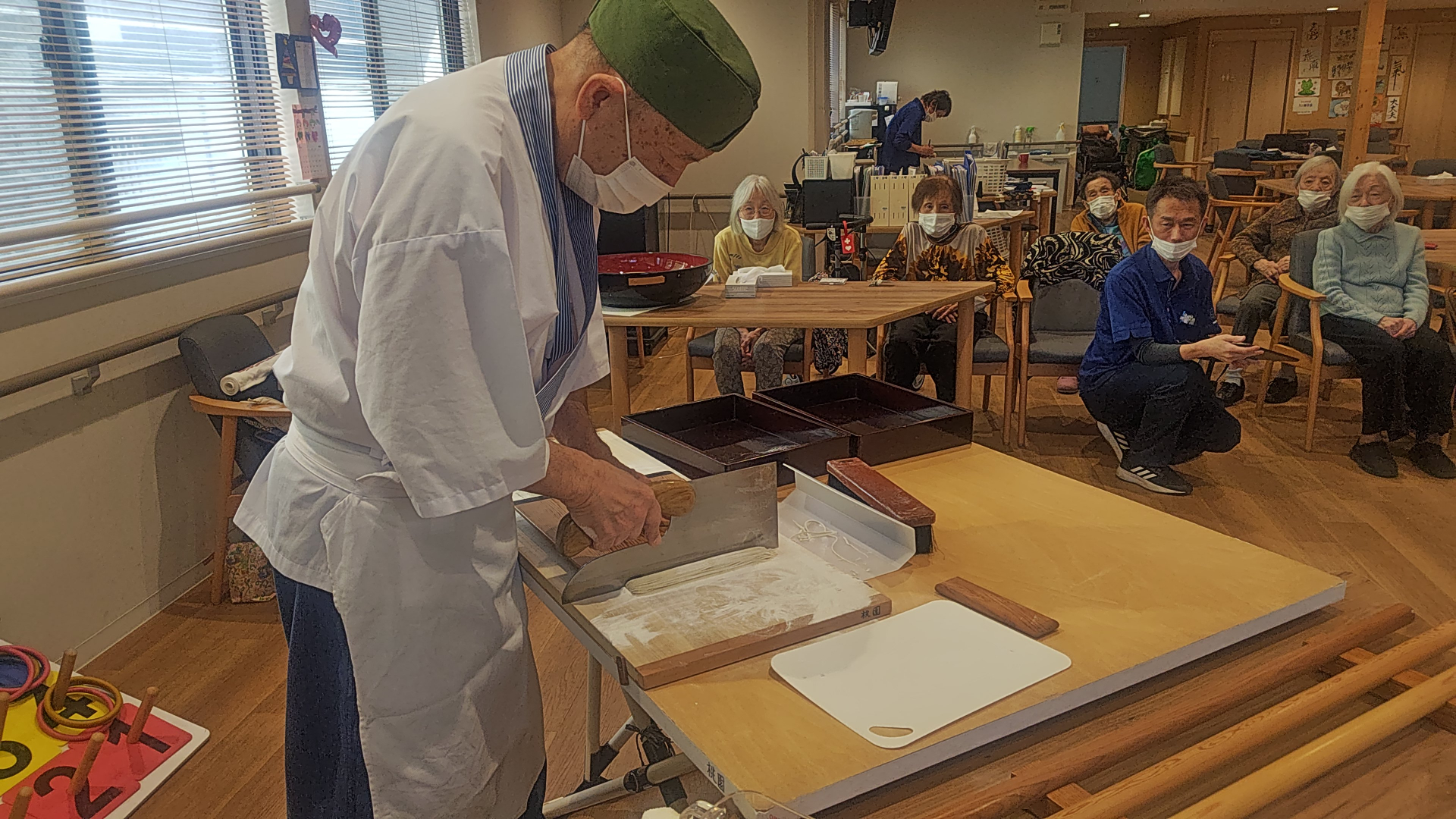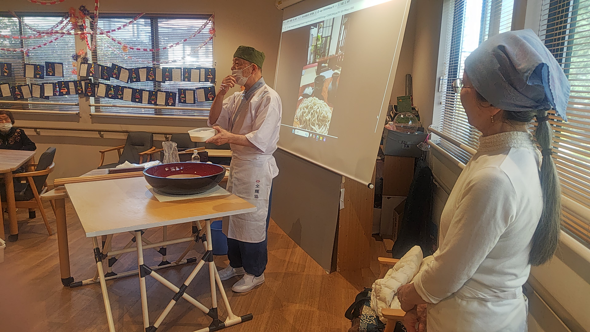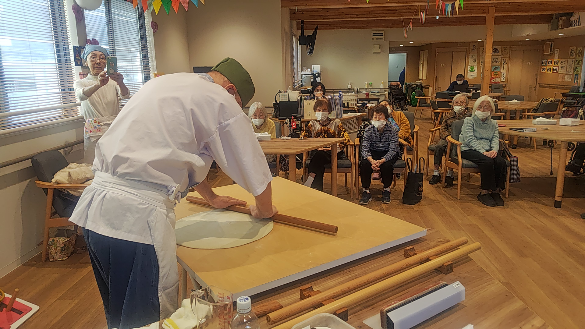 本業は染物屋さんらしく、ご利用者のH様のマンションの向かいとの事でご夫婦を見てすぐお声掛けをしていました。ただそば打ち五段で確かな技術で皆様に披露して頂きました。