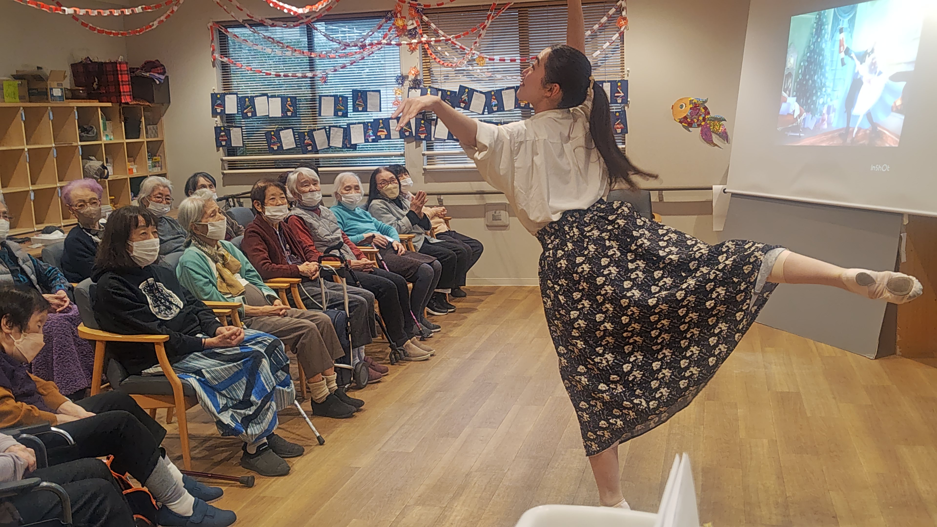 加來さんの「くるみ割り人形」のクラッシックバレーからスタートし、中村さんの迫力の声量でのヨーデルにご利用者様も圧倒され、お二人の歌と踊りに魅了されていました。