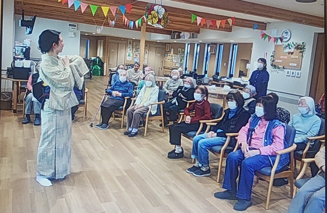 利用者様の「日本舞踊が観たい」の一言からI職員の知り合いの劇団民芸の印南 唯さんに踊って頂きました。何でも花柳流の先生の元、この日の為に3か月お稽古して開催されました。