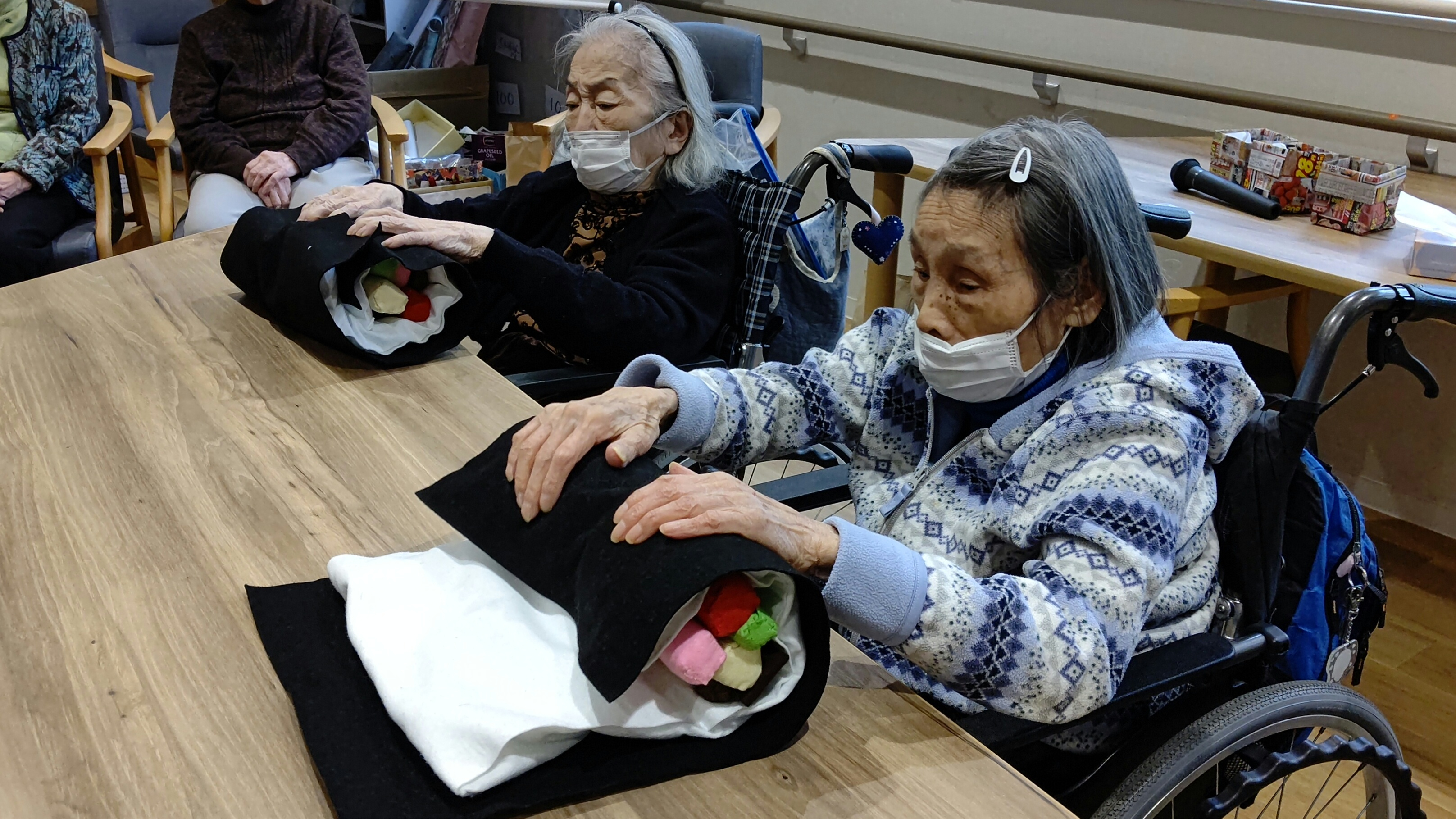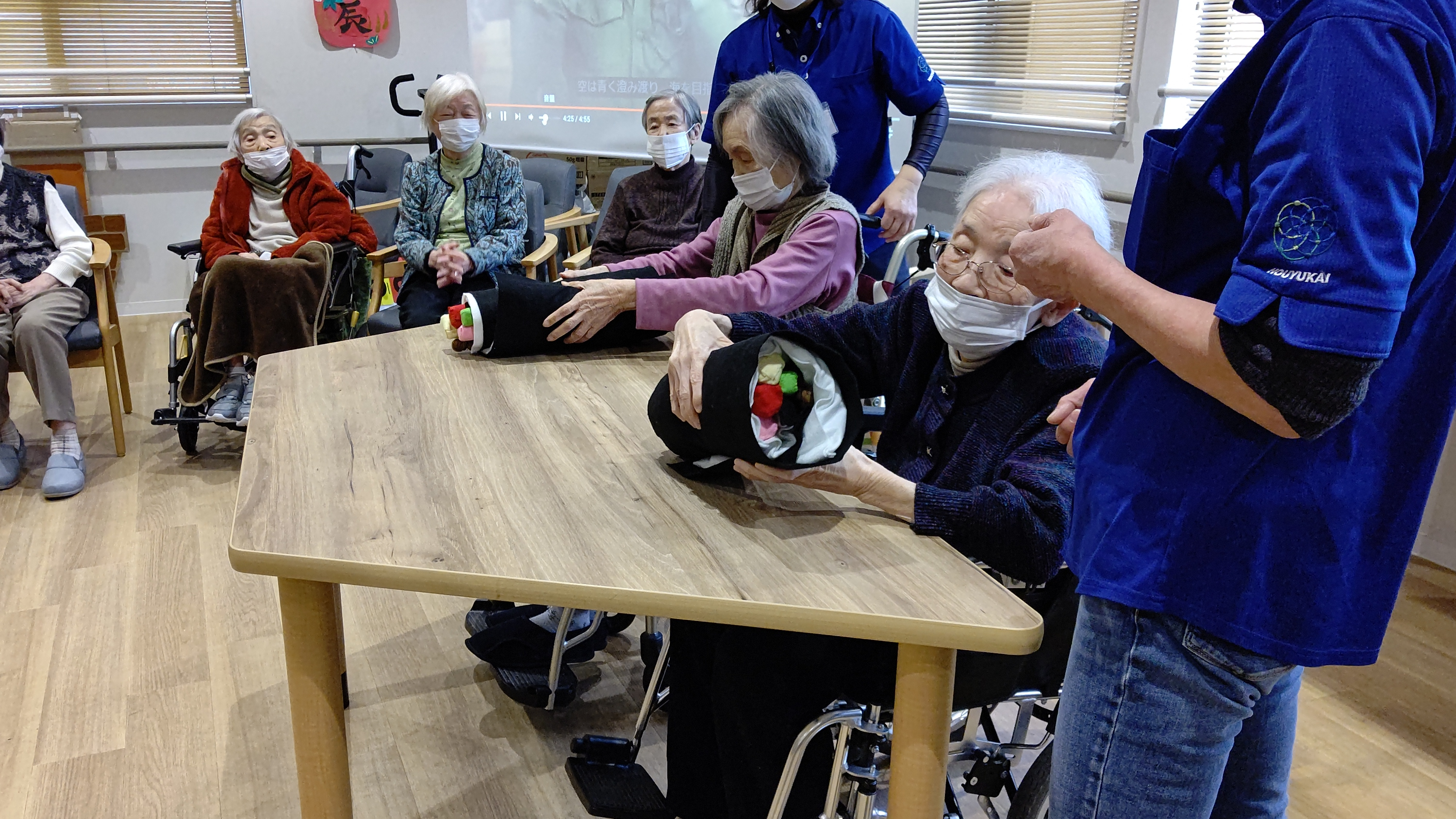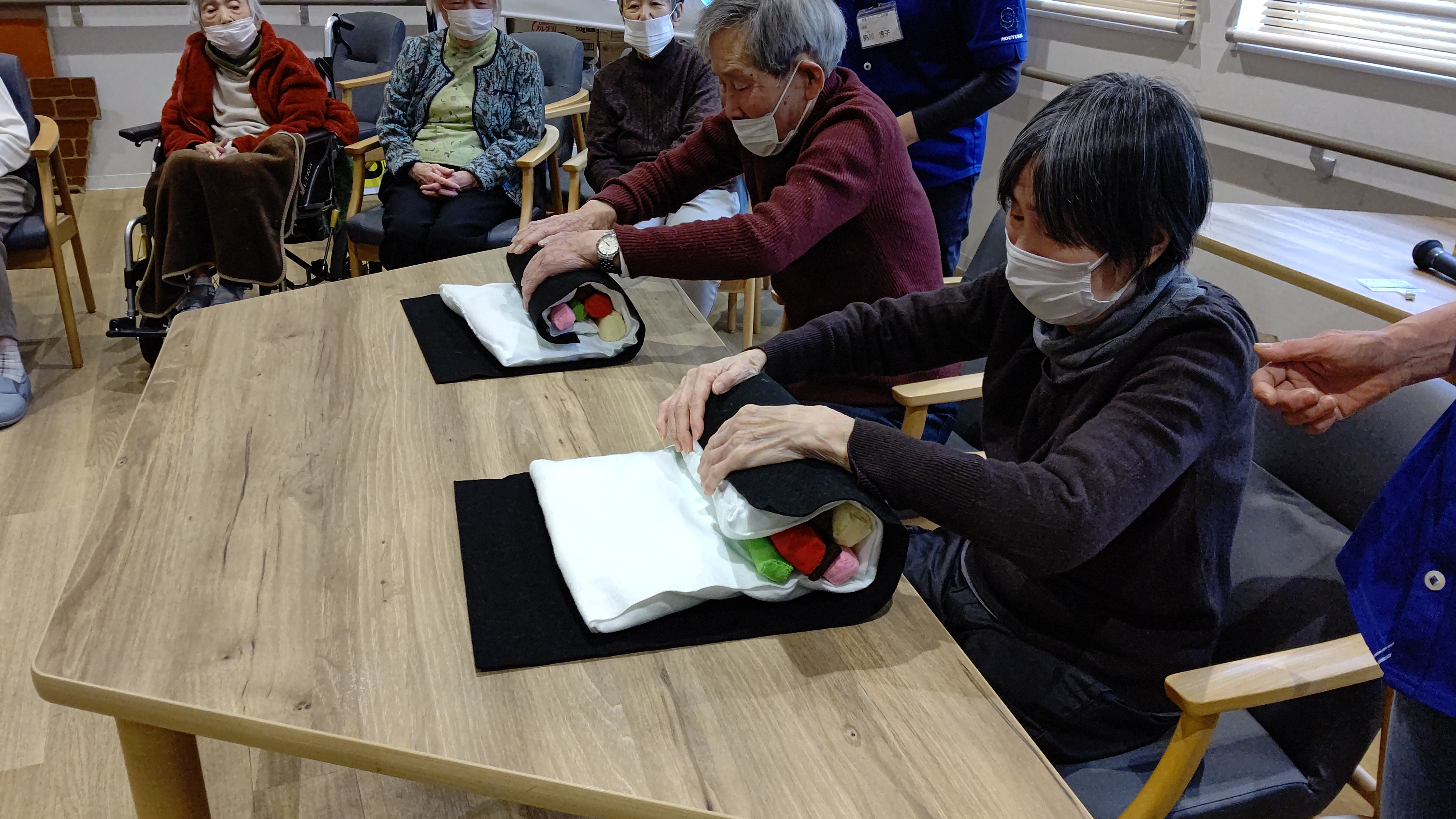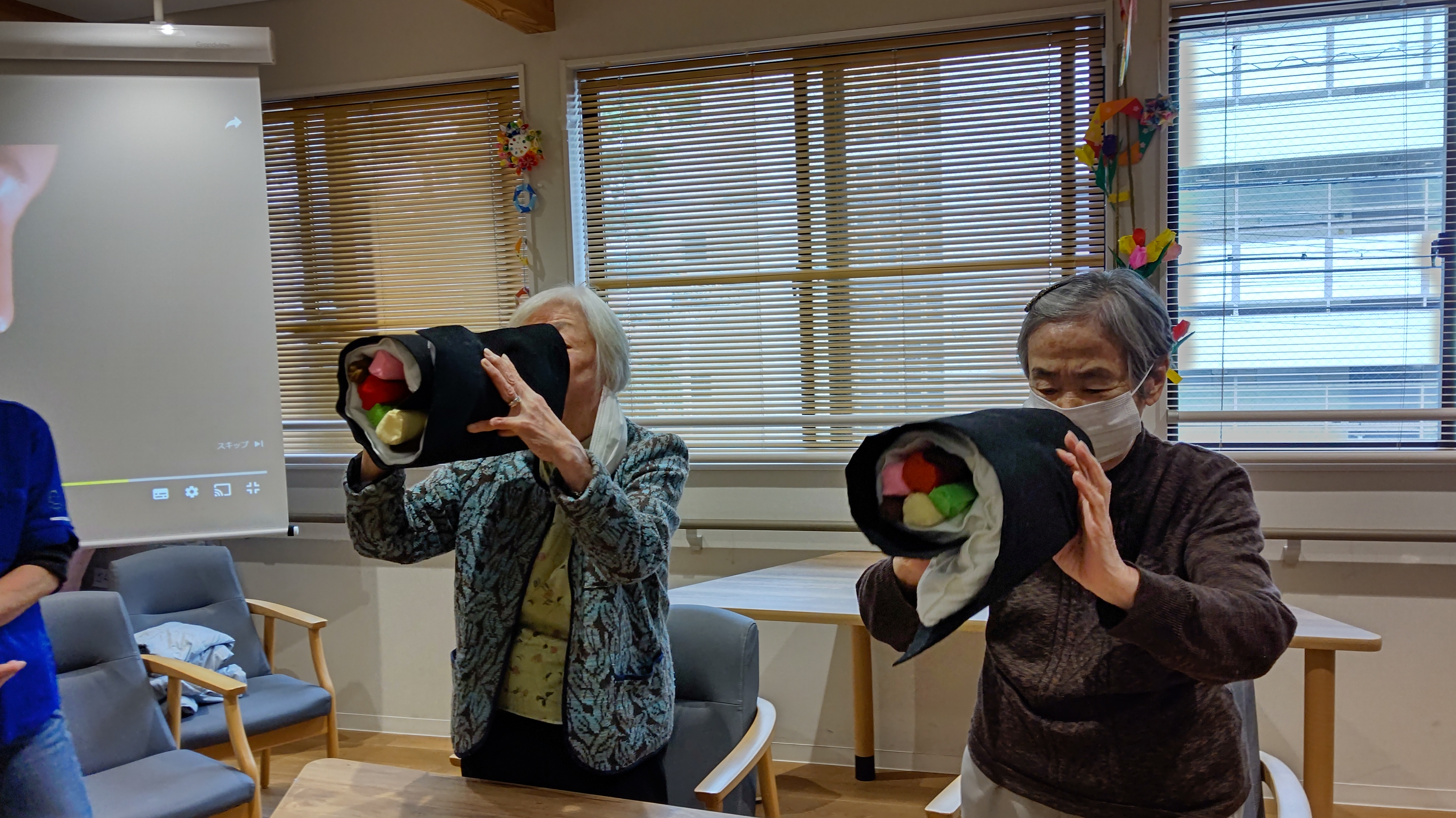 本日は恵方巻き巻きゲームを行いました。職員が作った秀逸な恵方巻の具材を巻くのを競うゲームで大いに盛り上がりました。