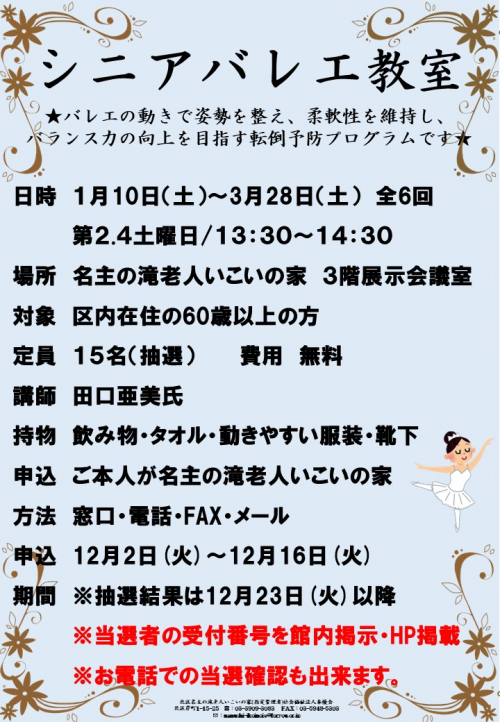 2025.12.04 【当選発表】「12月開催歌声サロン」抽選結果のお知らせ お知らせ 2025.12.03 脳いきいきタブレット講座開催致しました 活動報告 2025.12.03 【当選発表】12月スマホ交流会「スマホの基本操作」抽選結果のおしらせ お知らせ 2025.12.02 12月もみんなでボッチャ開催致します お知らせ 2025.12.02 筋トレ&ストレッチお申込み開始致します お知らせ 2025.12.02 シニアバレエ教室申込み受付開始致します お知らせ 2025.11.30 いこいこ体操開催いたしました 活動報告 2025.11.30 みなさまの健康法⑭ 高齢者福祉センター 2025.11.30 みんなでボッチャ開催致しました 活動報告 2025.11.30 【当選発表】「知っているはずの『国語』」抽選発表のお知らせ お知らせ 2025.11.30 「ソフトチェアロビ」受付開始いたします お知らせ 2025.11.29 初冬の「名主の滝老人いこいの家」 高齢者福祉センター 2025.11.28 【当選発表】12月開催クレヨンアート抽選結果についてぼお知らせ お知らせ 2025.11.28 【当選発表】「12月開催お正月のリース」抽選結果のお知らせ お知らせ 2025.11.28 【当選発表】「12-1月開催はじめてのヨガ教室」抽選結果のお知らせ お知らせ 1 2 3 … 57