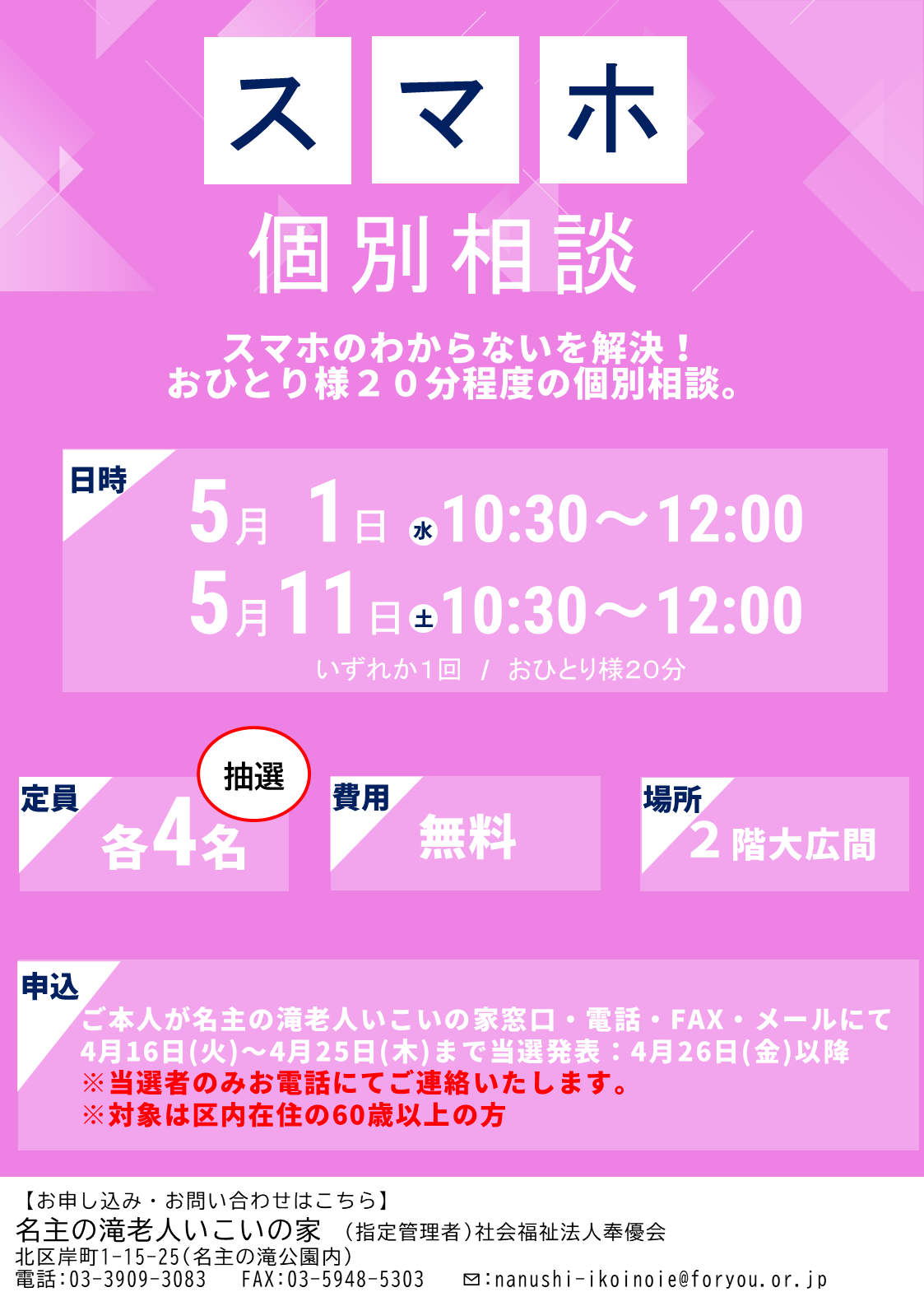 2024.04.16 お知らせ 5月のスマホ個別相談の申込開始しました Tweet シェアする 5月のスマホ個別相談の申込開始しております☆彡 短い期間の申込期間となりますのでお気を付けくださいませ。 ご応募お待ちしております。 佐々木 前の記事 2024.04.17 お知らせ みんなで脳トレ 次の記事 2024.04.16 お知らせ 【本日より申込開始です】やさしいピラティス 一覧へ戻る
