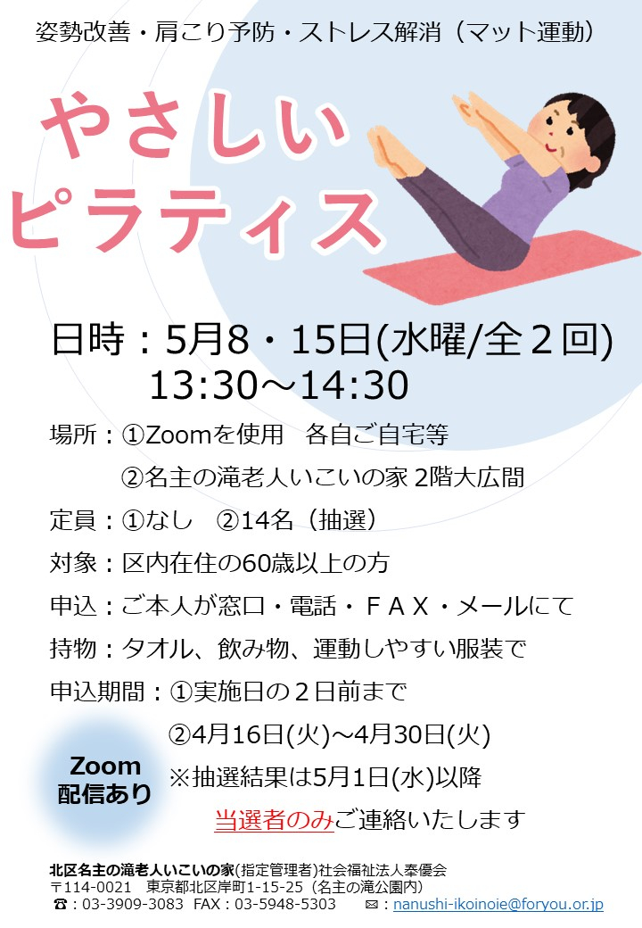2024.04.16 お知らせ 【本日より申込開始です】やさしいピラティス Tweet シェアする お申込みお待ちしております。 名主の滝老人いこいの家 伊達 前の記事 2024.04.16 お知らせ 5月のスマホ個別相談の申込開始しました 次の記事 2024.04.14 お知らせ 体操デビュー٩( ''ω'' )و 一覧へ戻る