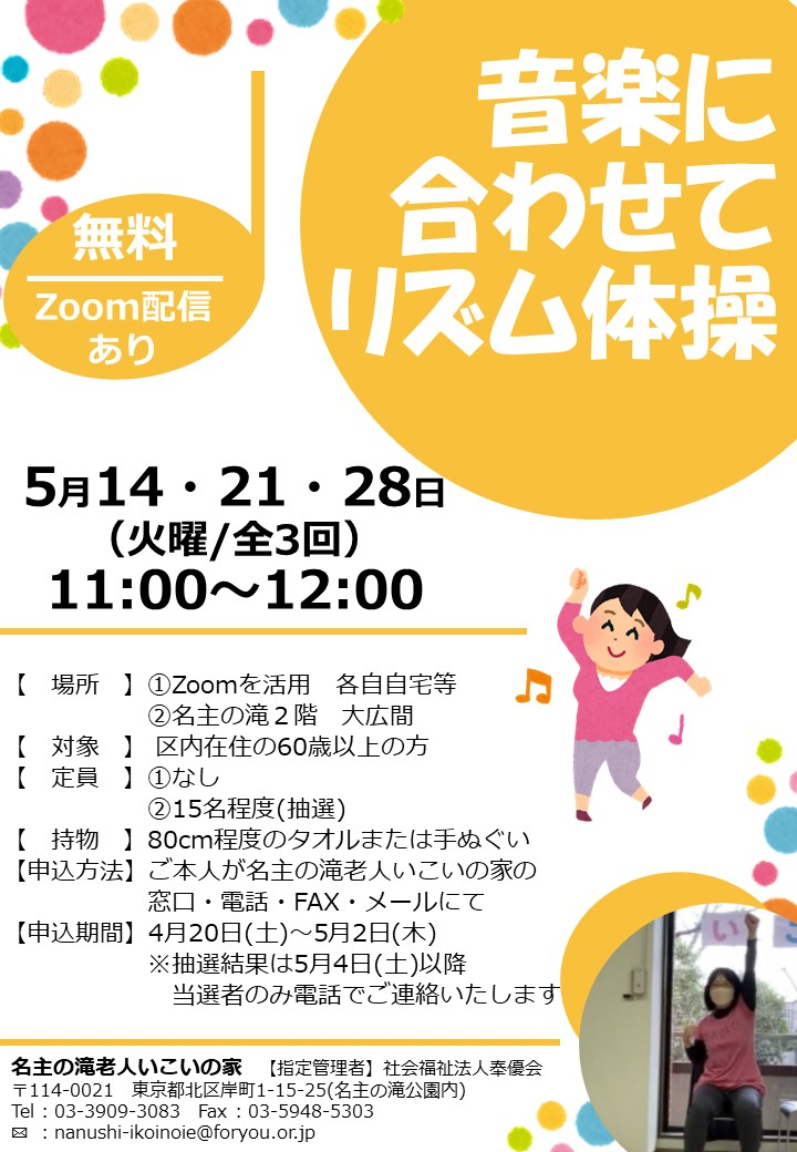 2024.04.20 お知らせ リズム体操♪ Tweet シェアする 皆さん大好き♡リズム体操♪5月より再開します! ズキズキ♪ワクワク♪一緒に体を動かしましょう! 名主の滝老人いこいの家 伊達 前の記事 2024.04.24 お知らせ 5月開催ペーパークイリング講座募集中です♪ 次の記事 2024.04.19 お知らせ 2回目・脳いきいきタブレット講座開催しました♪ 一覧へ戻る